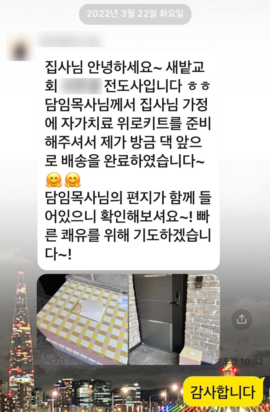 오늘 오전, 내가 섬기고 있는 교회의 전도사님이 카카오톡을 보내주셨다. 교회에서 준비해 주신 자가치료 위로키트를 문 앞에 배송해 놓고 가셨다는 카톡이었다.