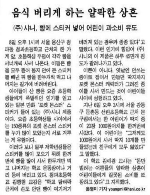 16년 전 포켓몬빵 열풍 당시 스티커만 모으고 빵을 버리는 풍경을 전한 <한겨레> 1999년 11월 9일 27면 기사