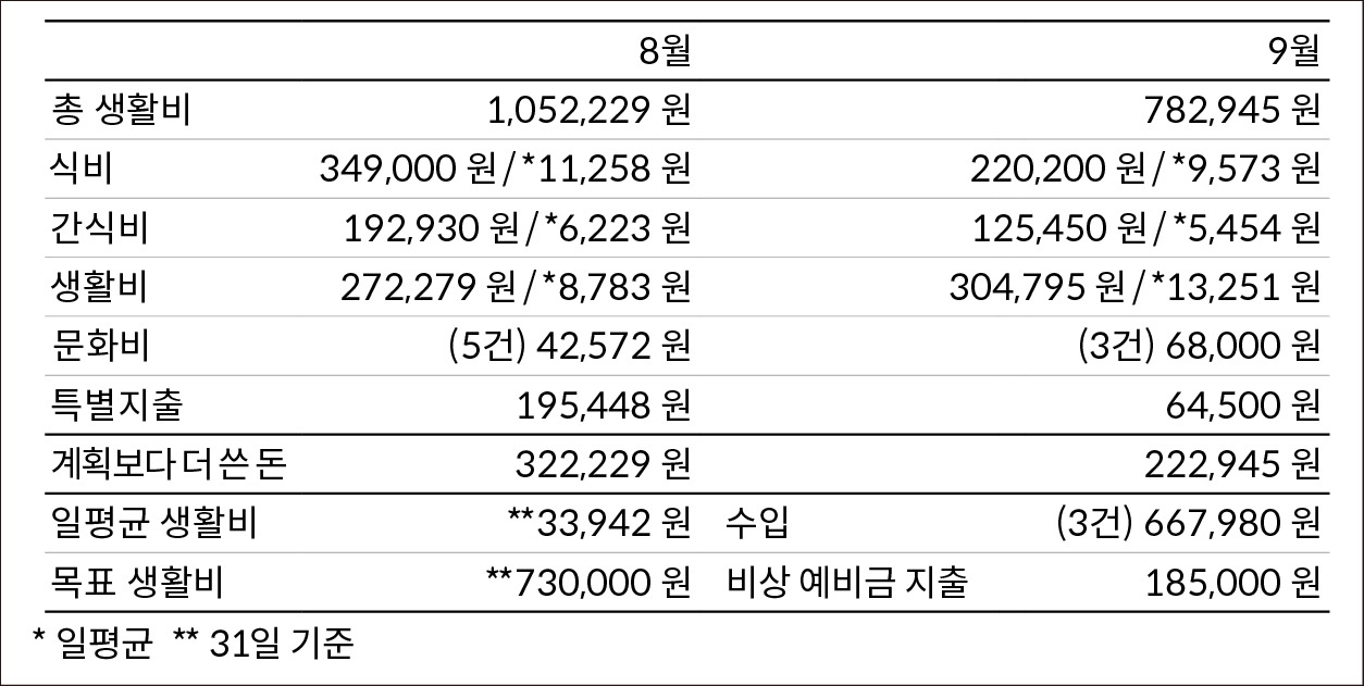 약 60만 원의 월세, 공과금, 통신비 심지어 기후동행카드의 교통비 등은 모아둔 정기자금 통장에서 별도로 해결하고, 체크카드와 연계된 생활비 통장에 56만 원을 넣어두고 여비를 가늠하였다. 이는 여행이 끝나고 크고 작은 소득이 생겨서 흐트러지게 된 것이기도 하다. 이를 바탕으로 한 8-9월의 소비 금액 비교는 다음과 같다.