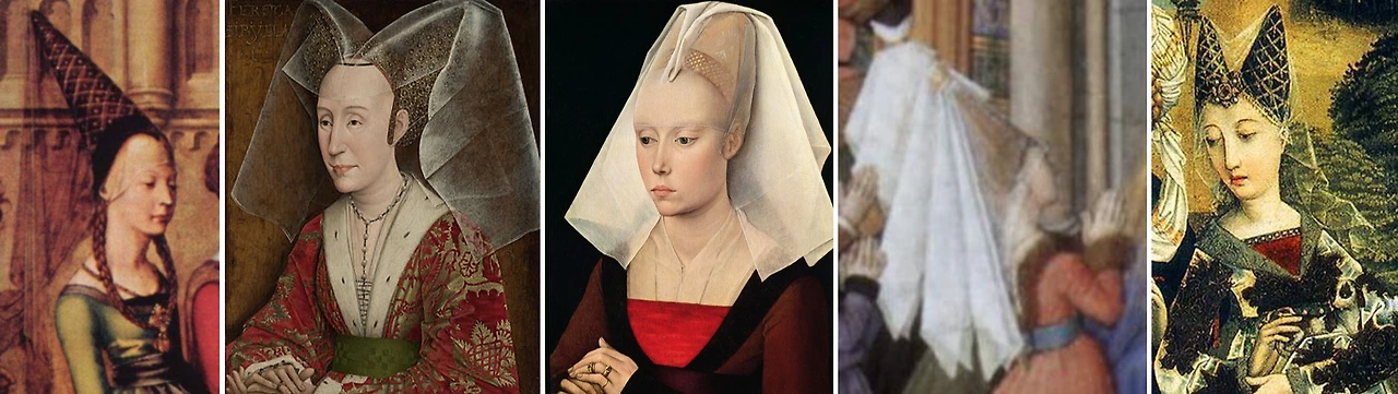 축축하고 더러워진 환경은 온갖 병균들의 파라다이스였으며, 14세기 중반에는 당시 유럽인들에겐 하느님의 형벌로 간주된 흑사병이 창궐하여 유럽 인구의 1/3이 넘는 수가 희생되는 등 그야말로 '혼돈의 카오스'인 시기를 보내며 나약해진 인간들은 불안한 마음을 신께 의지하게 되죠. 하여 패션도 자연스레 신께 닿고자 노력하는 '고딕 스타일'이 유행하게 됩니다. 대략 1380~1430년을 고딕 스타일의 전성기라 하는데, 오늘의 주인공인 에냉(Hennin)은 14세기 후반에 등장하여 15세기 내내 지체 높으신 여인네들에게 사랑받았습니다.