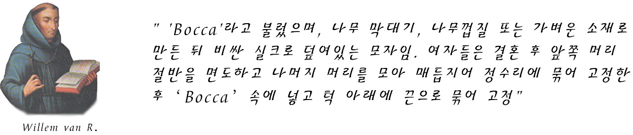 복탁은 몽골 여성 귀족들의 지위를 잘 나타내 주는 상징적인 복식으로, 진정 공주들과 왕비들이 착용한 모자입니다. 몽골어로 '복탁’은 서양 사람들에게 발음하기 어려웠던 걸까요? 13세기 중반 복탁을 처음 본 수사는 보까(Bocca)라 표현했으며 이후 보크타(Boqta)라는 비슷한 명칭으로 바뀌었는데, 아마도 그들의 귀에는 보까든 보크타든 복탁이든 모두 비슷하게 들렸나 봅니다.