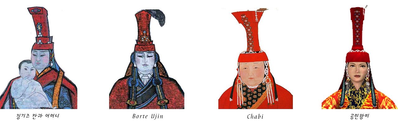 칭기즈 칸의 어머니도, 부인인 보르테(Borte)도, 손자 쿠빌라이(Kublai)의 부인 차브이(Chabi) 그리고 공민왕비였던 노국공주도.. 긴 시간의 흐름에도 크게 달라지지 않은 스타일을 고수하고 있음을 알 수 있습니다.
