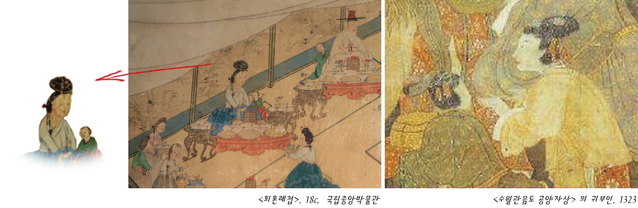 이 비슷한 형상을 고려불화 <수월관음도> 속 귀부인의 모습에서도 찾아볼 수 있습니다. 패션은 돌고 돈다고..