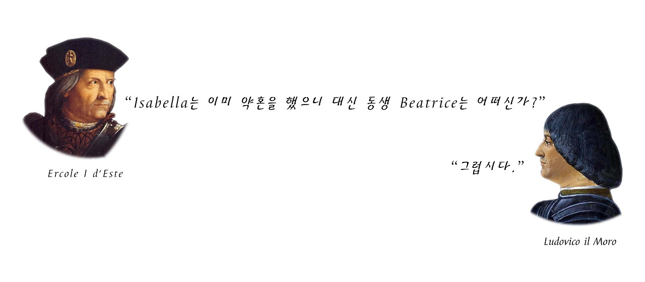 하지만 이사벨라는 바로 얼마 전 만토바의 프란체스코 2세{Francesco II}와의 약혼이 성사된 후였습니다. 밀라노의 힘 있고 부유한 스포르차 가문과의 동맹을 놓칠 수 없었던 아버지 에르콜레 1세는 부인의 조언을 받아 루도비코에게 4살 된 둘째 딸을 제안하죠. 현명하고 정치적 능력이 뛰어났던 엘레오노라의 계략이었지만, 사실 루도비코에겐 더 좋은 기회였습니다. 베아트리체를 특히 예뻐했던 나폴리의 왕인 할아버지 페르디난도 I세가 이 결혼에 큰 관심을 보인다는 사실이 더욱 루도비코의 구미를 당겼죠.