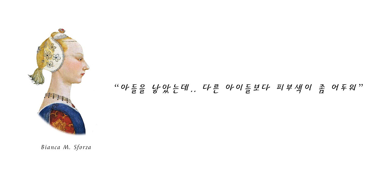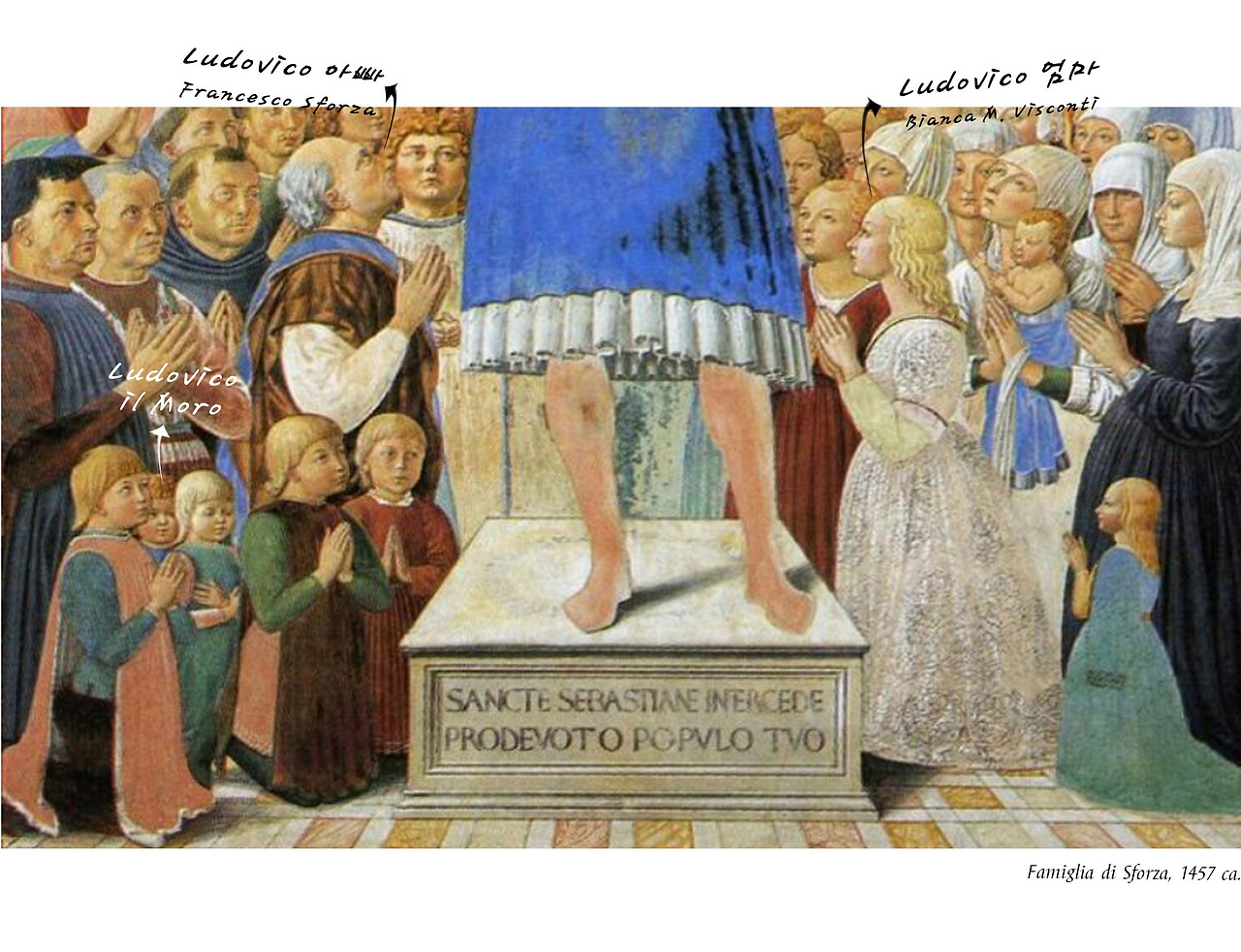 가족 그림 속 유난히 까만 아이가 바로 루도비코로, 짙은 피부에 검은 눈과 머리카락을 가지고 태어난 루도비코를 아버지는 어릴 적부터 ‘Maurum(=Moro)’이라 부르곤 했습니다. 하여 그의 정식 이름인 'Ludovico Maria Sforza'보다 루도비코 일 모로{Ludovico il Moro}라 불렸는데, 보통 ‘검은 머리와 어두운 피부색 때문에 무어인(Moor)을 뜻하는 모로{Moro}로 불렸다’ 라거나 ‘밀라노에서 실크 생산을 개발하려는 루도비코의 정책 -뽕나무를 밀라노에서는 모론{Morón}으로 부름- 때문에 일 모로{il Moro}로 불렸다’라고 알려져 있죠.