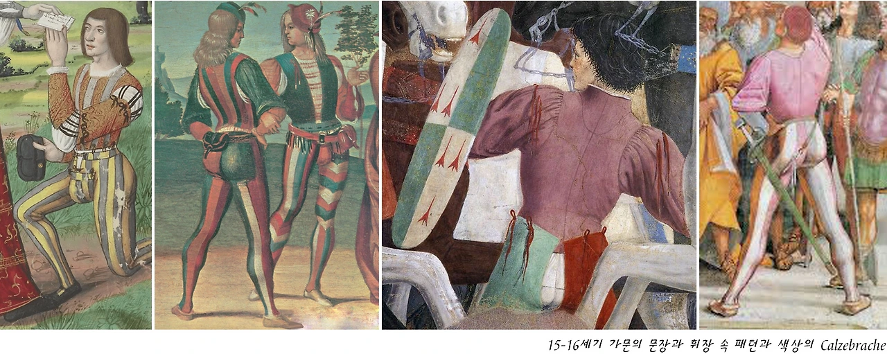 15세기 초중반에는 분리된 형태의 칼제브라케를 허벅지까지 끌어올려 린넨으로 만든 속옷에 끈으로 고정시켜 입었으나 15세기 중후반에는 양쪽이 결합돼 엉덩이를 감싸주는 바지로 발전하죠. 발 부분은 발까지 모두 감싸는 형태와 고리바지처럼 고리로 된 형태가 있었습니다.