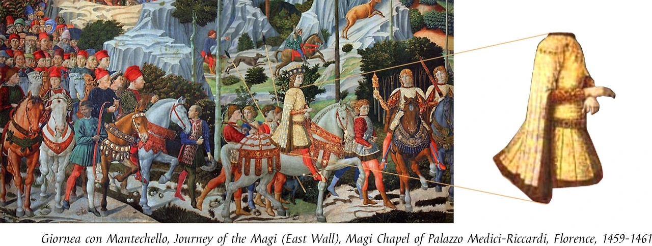 14세기 군사 복식에서 유래된 조르네아는 15세기 이탈리아에서 유행한 우아한 겉옷으로, 하루를 뜻하는 'giorno'의 어원에서 온 것처럼 매일 입는 일상복처럼 애용되었습니다. 그림 속 형형 색색의 의상들에서 알 수 있듯이 당시엔 염색법이 매우 발달해 있었으며, 자주색이나 검은색 같은 비교적 까다로운 공정을 거쳐야 하는 어두운 색의 천들은 부와 권력의 상징이었고 금실로 짠 의상은 동서양을 막론하고 아무나 입을 수 없었죠. 격식을 차려야 할 때는 가문의 문장과 휘장으로 장식한 화려한 조르네아를 걸쳤는데 모피로 가장자리를 감싸고 안감은 실크로 마감했습니다.
