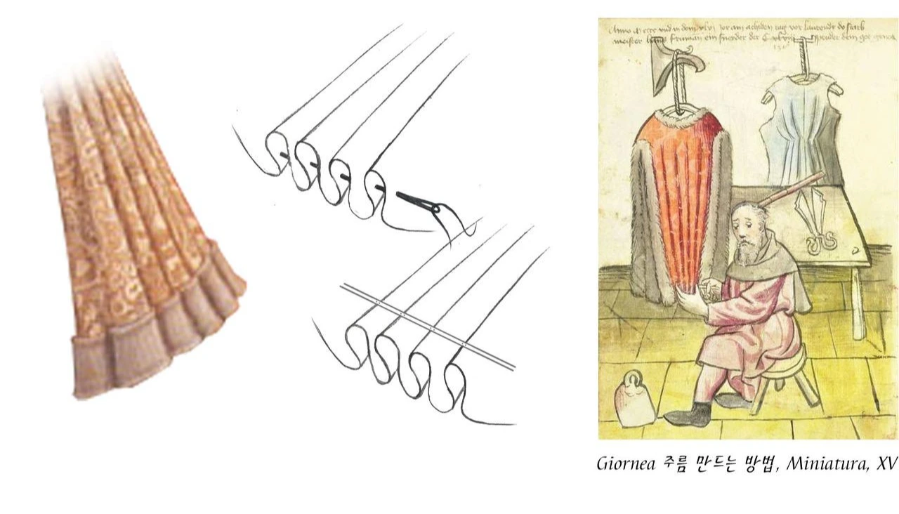 어깨만 이어진 앞 뒤 판을 걸쳐 입는 매우 편한 의상으로, 고정하지 않은 채 입거나 앞판 허리 부분에만 허리띠를 둘러 입었습니다. 지금 입어도 굉장히 편하고 유용할 디자인의 조르네아는 15세기 내내 남녀노소 모두에게 사랑받다 15세기 후반에 사라지죠.