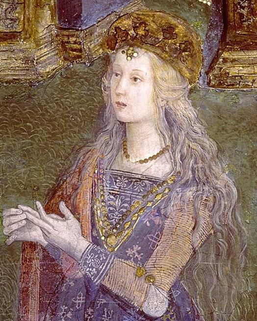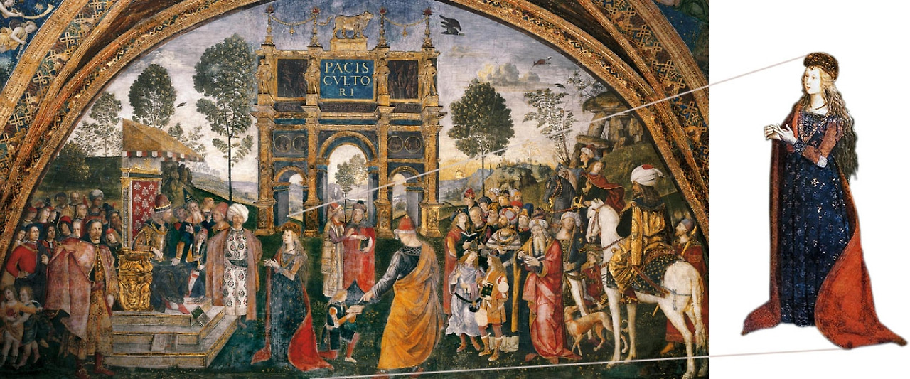 루크레치아가 14살 무렵 그려진 것으로 추정되는 바티칸의 보르지아 아파트 벽화 속 그녀는 카테리나{Caterina} 성녀 -4세기 성인- 의 모습으로 주위를 둘러싼 이교도들을 자신의 지혜와 화술로 설득하고 있는 중입니다. 아버지 로드리고가 교황으로 선출되었기 때문에 이렇게 벽화에 가족의 모습을 남겨놓을 수 있었죠.