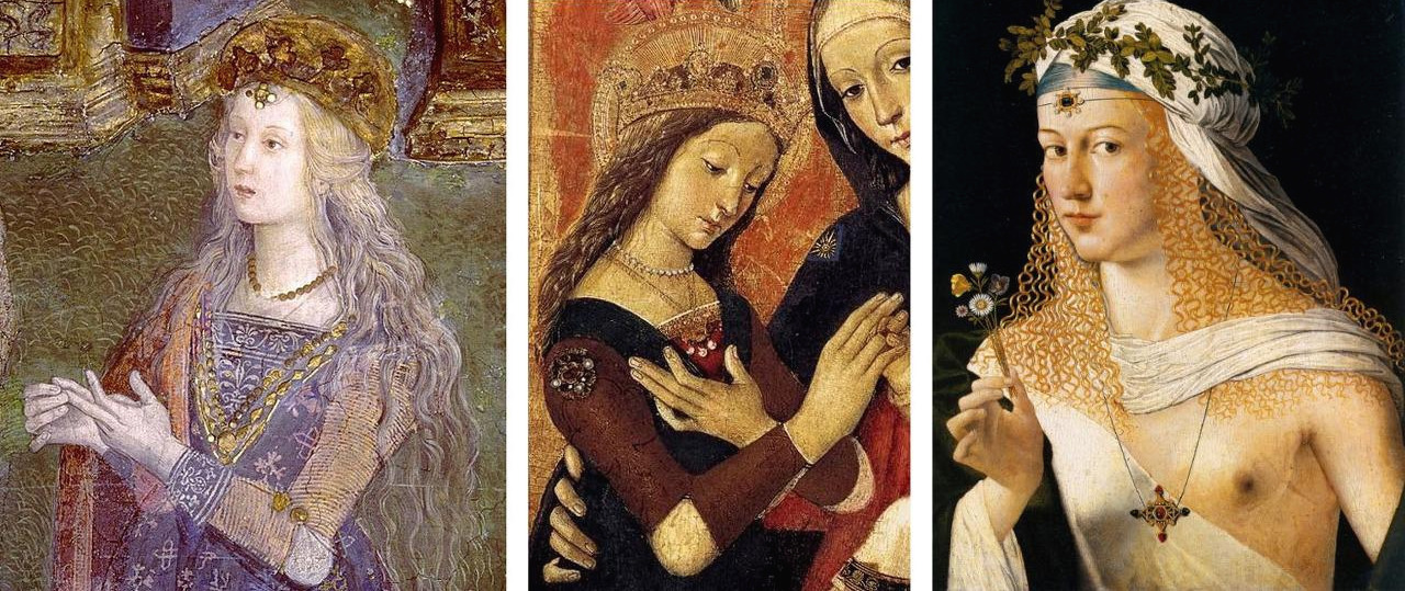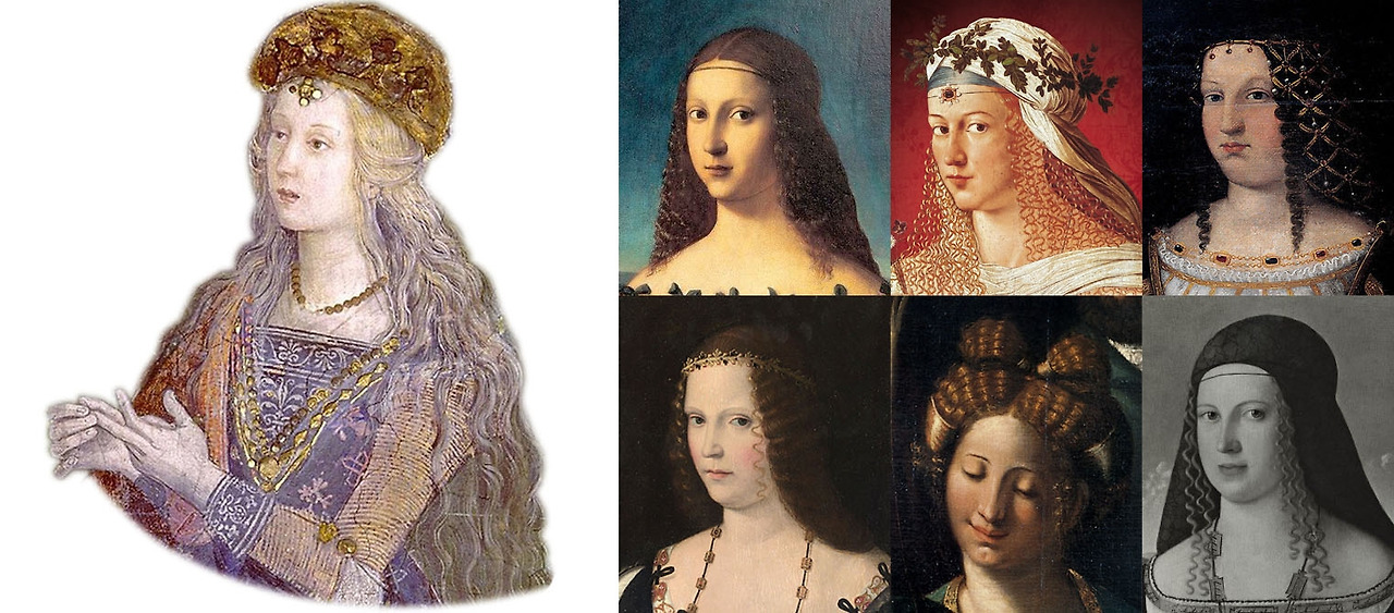 베일에 가려졌던 여성의 아름다운 머리는 15세기 후반 무렵부터 해방되기 시작했는데, 루크레치아는 그중에서도 가장 파격적인 스타일을 선보였습니다. 결혼한 다른 여인들이 얇은 베일로 푼 머리를 감싸기라도 할 때 그녀는 머리카락에 진정한 자유를 선사했습니다.