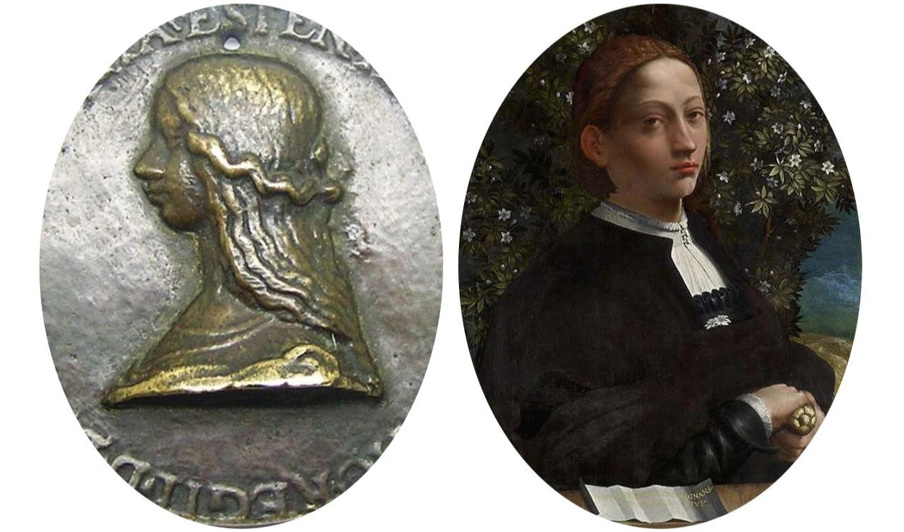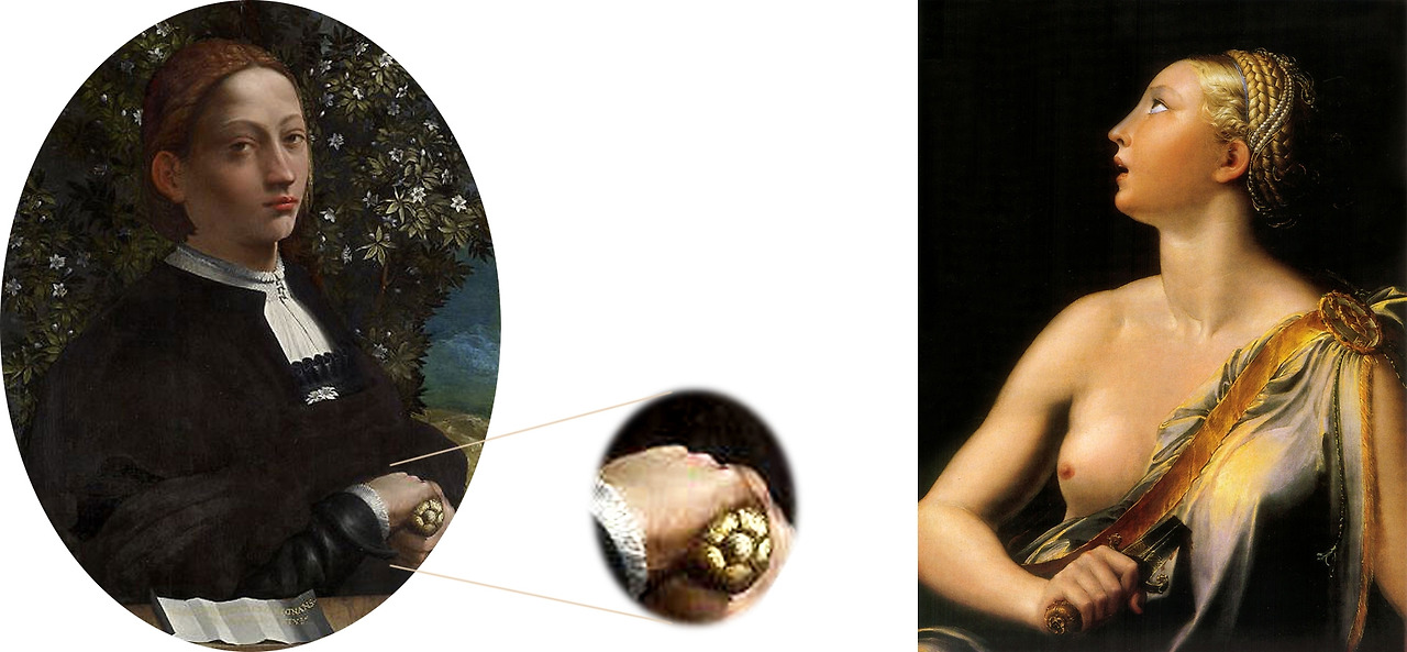 무표정의 꾸미지 않는 머리와 검은 의상의 이 초상화는 21세기 초까지만 해도 청년의 초상화로 간주되어 왔죠. 손에 쥐고 있는 단검과 짧아 보이는 머리로 인한 오해였는데, 르네상스 시대에 살던 여성이 무기를 들고 초상화를 그렸을 리 없다고 생각했기 때문입니다. 르네상스의 그림에서 단검을 들고 있는 여성은 - 자신의 명예를 지키고 복수를 위해 단검으로 심장을 찔러 자결한 고대 로마의 루크레티아{Lucretia}를 상징합니다. 르네상스 시대 미덕의 아이콘으로 숭배되었던 루크레티아의 모습으로 그려진 이 초상화가 그녀의 사후에 그려진 것이라면 당시 그녀에 대한 이미지는 현대 일반적인 평과는 현저히 다름을 알 수 있습니다.
