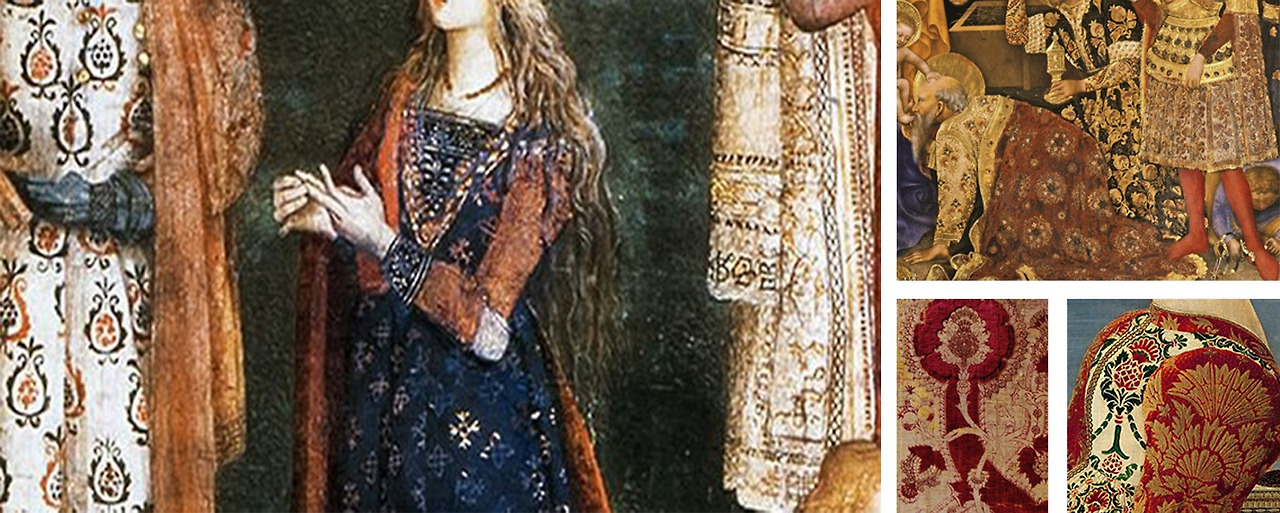 유독 화려함이 눈에 띄는 그림 속 등장인물들의 의상은 동양과 중동의 취향으로, 당시 직물 디자인은 기본에서 벗어나 동방에서 온 크고 강렬한 문양으로 대체되었습니다. 주로 꽃, 엉겅퀴, 파인애플, 솔방울 등 식물 모양에서 모티브를 얻어 매우 정교하고 명확하게 금·은실로 직조되었죠.