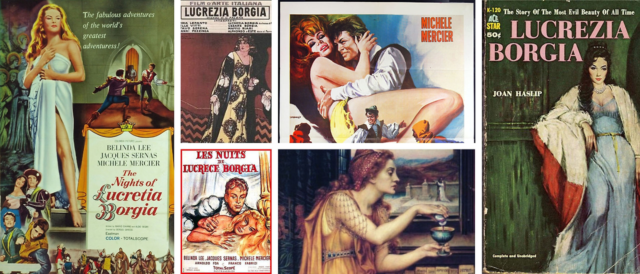 보르지아 집안은 잔악한 행위를 일삼는 타락의 대명사가 되었고, 빅토르 위고로 인해 루크레치아는 독살범이라는 소문도 추가되어 파티에서 정적들을 독살하고 가족과 근친을 하는 희대의 요녀가 되었죠. 위의 포스터나 책 표지에서 볼 수 있듯 그녀의 이름이 들어가면 여주인공들은 섹스 심벌의 모습으로 등장했습니다.