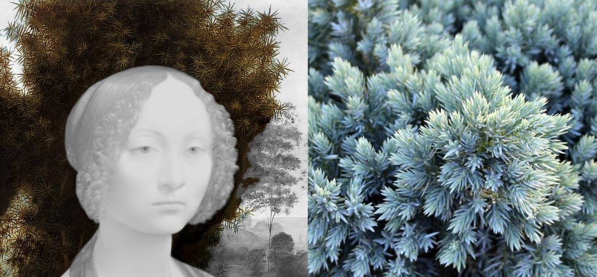 여인의 뒷배경을 장식하고 있는 검은 물체는 '순결'을 상징하는 향나무속{Ginepro}으로 여인의 이름 지네브라{Ginevra}를 암시해주는 말장난이다.