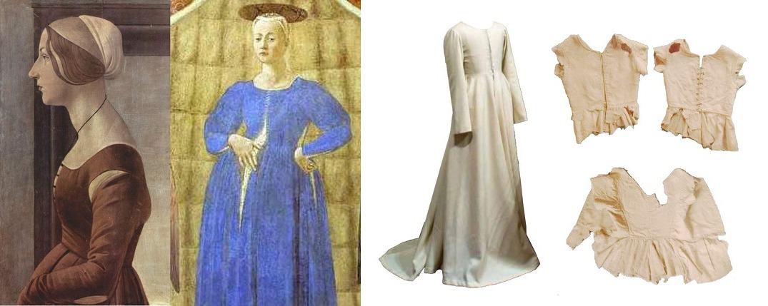 다소 깊게 내려간 사각 형태의 목선은 당시 아름다운 모습이라 생각했던 여인의 둥근 어깨를 강조해주기 위한 장치였다. 과도하게 내려간 목선으로 드러난 가슴 부위는 실크나 리넨으로 된 코베르치에레{Coverciere (Partlet)}로 가렸는데, 이는 예쁜 목선을 가리기 싫었던 여인들로 인해 새로 생겨난 패션이다.