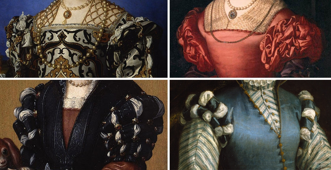 16세기 인기를 끌었던 패션인 부착형 슬릿 소매는 여전히 유행 중이었습니다. 어깨선이 더 내려갔고, 소매와 몸통을 끈으로 엮어주면서 생기는 틈새로 속에 입은 셔츠를 꺼내 퍼프소매처럼 큰 볼륨감을 주어 전체적으로 넓은 어깨가 형성되었습니다. 이 넓은 어깨가 시대적 미적 포인트였죠. 한동안 여인들의 어깨는 끝간데를 모르고 넓어져만 갔습니다.