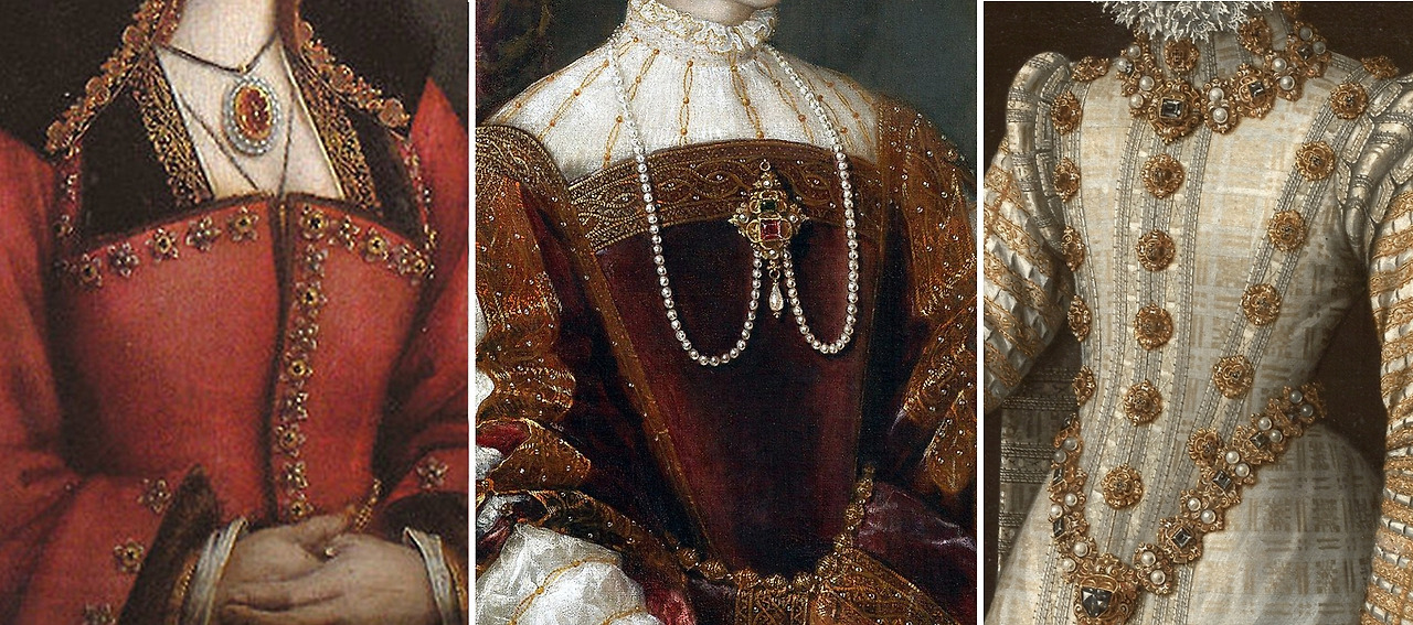 스퀘어 네크라인으로 넓게 파인 부분은 금실에 진주를 달아 만든 그물망으로 덮었는데, 이는 점점 더 넓고 깊어지는 목선을 법령으로 금지시키자 여인들이 새로 만들어 유행시킨 코베르치에레{Coverciere(Partlet)} 패션입니다.