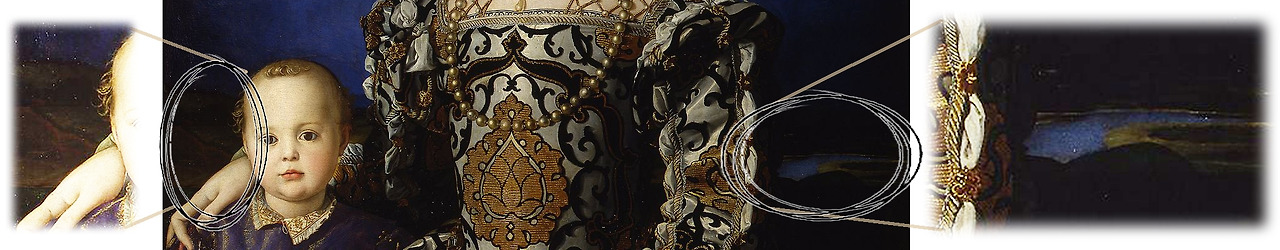 레오노르의 경우 완전한 선전용 초상화로 매우 이상화된 왕비의 모습을 보여주고 있습니다. 궁정화가 아뇰로{Agnolo Bronzino}는 레오노르를 아들과 함께인 자애로운 어머니이자 섭정의 이미지로 표현하고자 했습니다. 그림 속에는 그녀의 계급 · 권력 · 재력 · 모성애를 보여주기 위한 요소들이 세심하게 배치되어 있으며, 드레스에도 많은 의미가 담겨있죠.