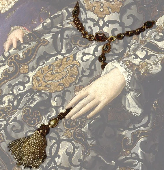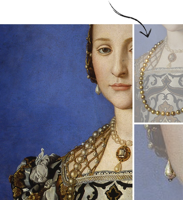 당시엔 '진주는, 진주를 착용한 사람들을 겸손하고 정숙하게 살도록 유도한다'라고 생각했습니다. 하여 신부에게 적합하다고 여겨 신부들은 진주로 치장했고, 결혼 선물로 진주 목걸이를 받기도 했죠. 레오노르의 목을 장식하고 긴 진주 목걸이 또한 코시모 1세의 결혼 선물이었습니다. 이후 이 목걸이는 토스카나 공작부인을 상징하며 대대로 물려졌습니다.