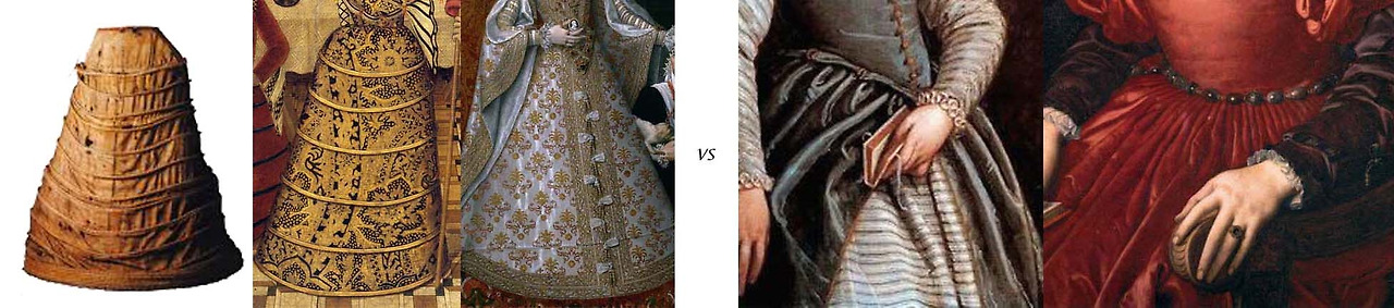 스타일이 나뉘게 된 스커트 부분은 - 스페인은 앞으로 유럽 드레스의 지배적인 실루엣을 만들어 줄, 스커트 지지대인 베르두가도{Verdugado(파팅게일의 원조)}를 착용 시 형성되는 종 모양 스커트였다. 비슷한 시기 이탈리아식 스커트는 속치마를 입고, 겉치마 허리라인에 많은 주름을 잡아넣어 풍성하게 만든 실루엣이 유행했습니다.