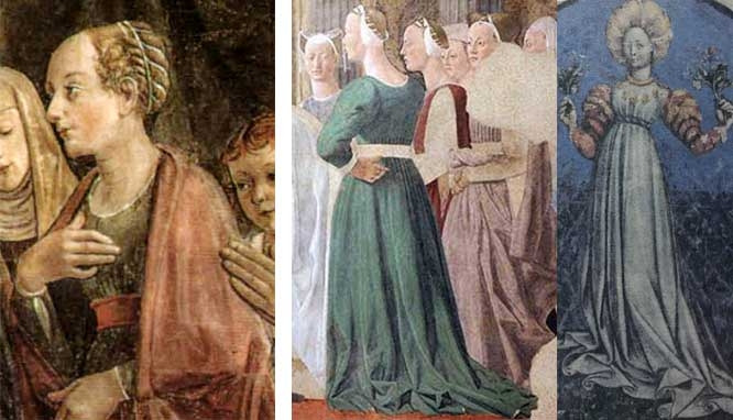 그녀의 의상은 아직 중세 후기의 영향을 받은 드레스 코타{Cotta}로 주로 여름에 입은 긴 드레스입니다. 원피스형 드레스의 넉넉한 품은 가슴 아래 부분에서 벨트로 조여 여성스러운 라인이 드러나 교회가 싫어했습니다.