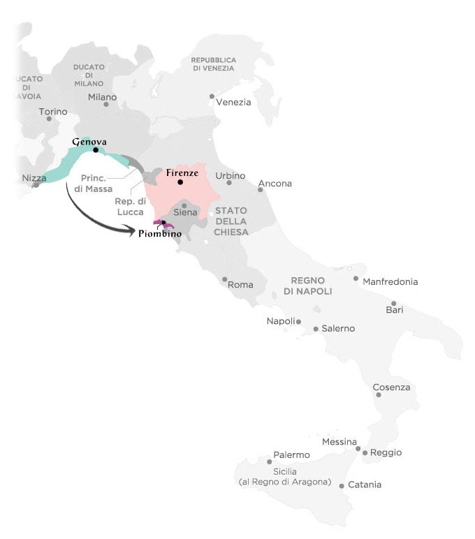 시모네타의 어머니는 전 제노바 공화국 총독의 부인으로, 남편이 죽고 난 후 공화국의 원로인 고귀한 카타네오{Cattaneo} 가문의 가스파레{Gaspare}와 결혼해 시모네타를 낳았습니다. 최고위층으로 안락한 삶을 살았던 가족은 시모네타의 오빠(이부)이자 제노바 총독인 피에트로{Pietro}에게 정치적으로 문제가 생기자, 피렌체 근처의 작은 해안국인 피옴비노{Piombino} 후국으로 정치적 망명을 하게 됩니다. 이곳에서 그녀는 피렌체에서 온 한 남자를 만나죠.