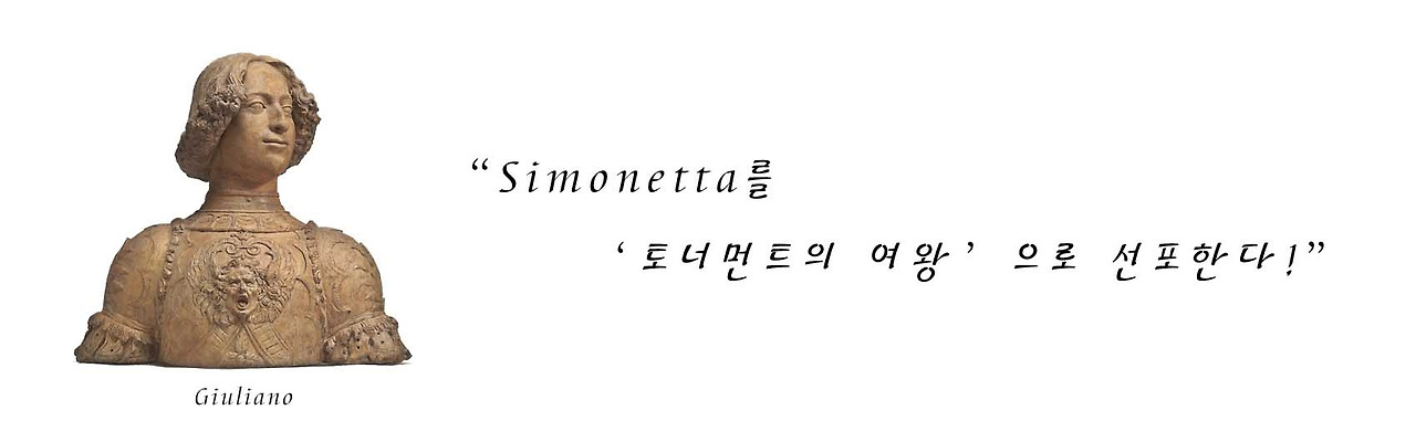 피렌체 사람들이 사랑했던 미혼의 젊은 왕자 줄리아노는 특히 토너먼트에서 빛이 났습니다. 그는 큰 승리를 거두었고 역사에도 '줄리아노의 조스트라'로 기록되었습니다. 그동안 조용하고 사람들 앞에 잘 나서지 않았던 시모네타는 대중 앞에 모습을 보이며 기쁜 마음으로 줄리아노를 축하했고, 그는 그녀에게 승리를 바치며 외쳤죠.