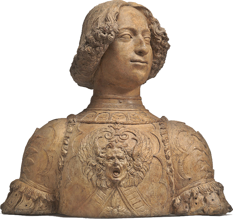 21살의 줄리아노는 말 위에서 보석으로 장식된 눈부신 은 갑옷을 입고 위풍당당하게 무기와 깃발을 든 채 입장했습니다. 베로키오{Verrochio}가 만든 흉상에서 출전 당시 착용했던 갑옷 그대로의 늠름한 모습을 볼 수 있습니다.