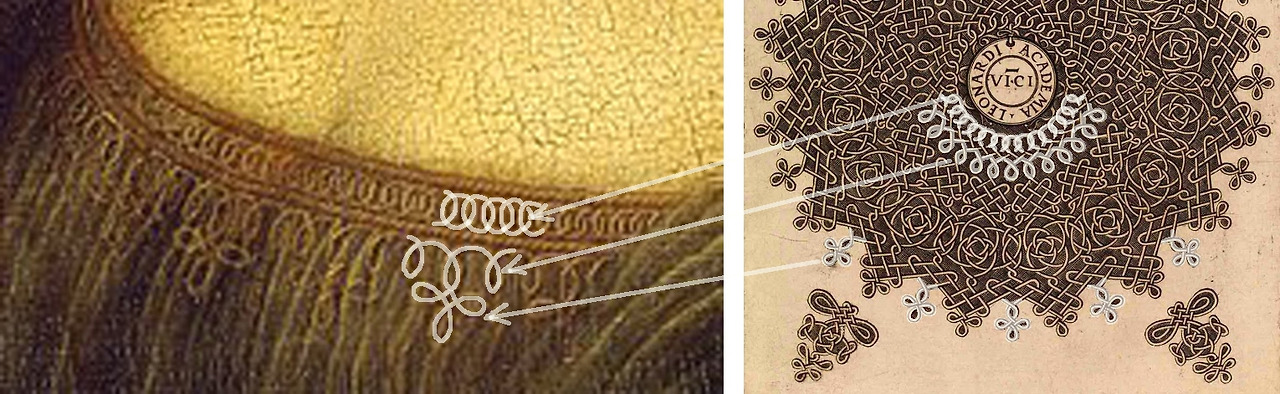 이러한 특정 문양은 그림에 대한 정보를 얻을 수 있는 중요한 단서가 된다. 레오나르도의 그림 속에 의미 없이 존재하는 것들은 없기 때문에, 이 문양은 모델이 밀라노 궁정의 스포르차{Sforza}가문에 속함을 나타내는 표식이라고 보는 전문가들도 있었다. 하지만 모나리자의 의복은 여러 스타일이 혼재되어 있기 때문에 이 자수장식은 스포르차 궁정의 표식으로 그려졌다기보다는 레오나르도가 그린 그림에 나타나는 그만의 시그니쳐라 볼 수 있다.