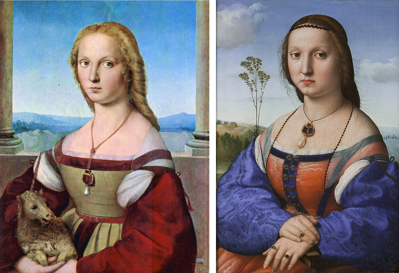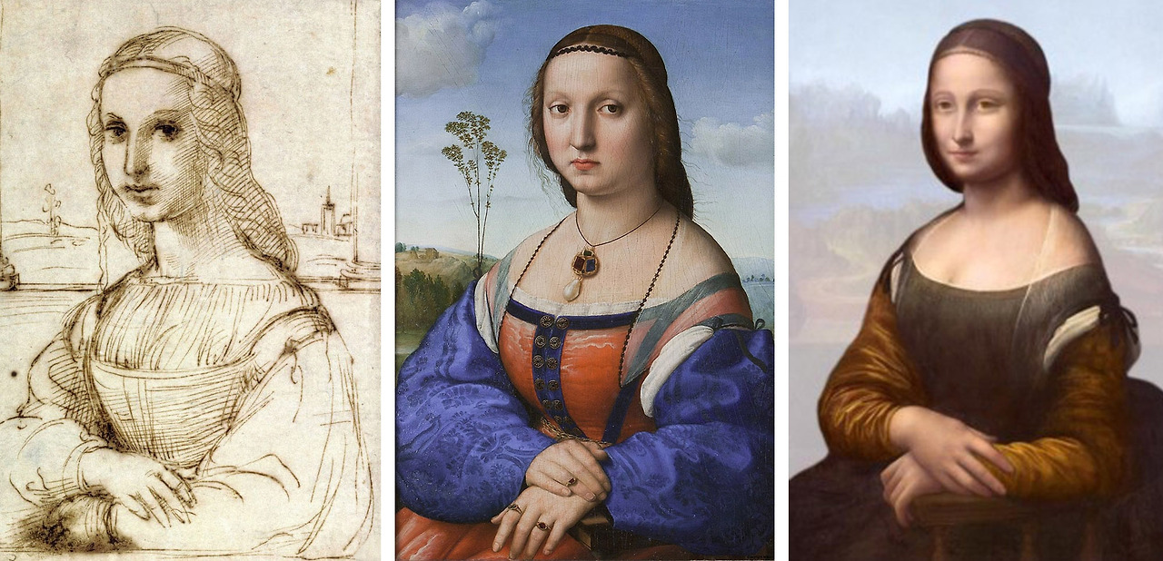 [아일워스의 모나리자]의 배경에는 양 옆으로 기둥이 있는데, 이는 1504년경 화가 라파엘로{Raffaello Sanzio}가 피렌체에 머물던 시기에 그린 스케치와 -모델의 포즈와 배경, 머리스타일- 매우 유사하다. 라파엘로는 당시 베키오{Vecchio}궁의 홀에서 작업 중인 대가 레오나르도를 보았고 그가 그린 초상화 속 여인에 영감을 받아 스케치를 남겼다. 이후 라파엘로는 두 점의 여인의 초상화 또한 비슷한 구도와 분위기로 그려냈다.