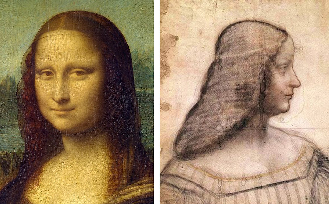 밀라노부터 다른 궁정들을 거쳐오며 최신 유행을 알고 있던 화가에 의해 앞서가는 스타일로 연출된 모나리자의 머리는, 자세히 보면 완전히 풀어헤친 머리가 아니다. 이는 얼마 전 레오나르도가 스케치만 그려주고 도망친 이사벨라{Isabella d’Este}의 머리스타일과 비슷하다. 곱실거리는 옆머리를 좀 더 빼주고 나머지 머리는 모아 뒤로 보내 얇은 망사로 된 보닛에 넣어 둥근 형태의 머리 모양으로 정리한 스타일이다.