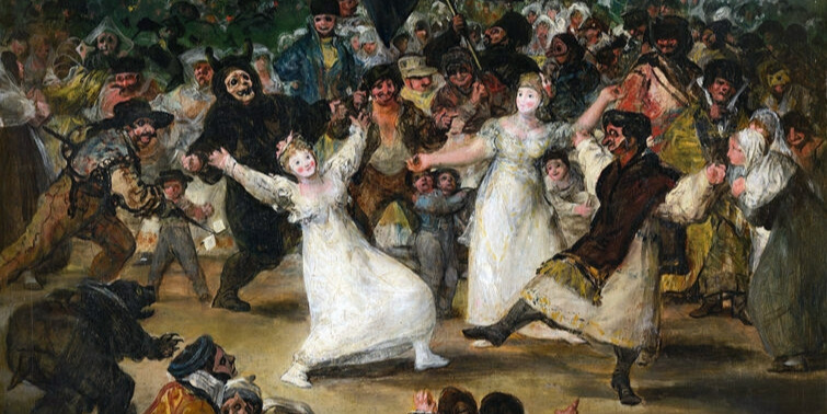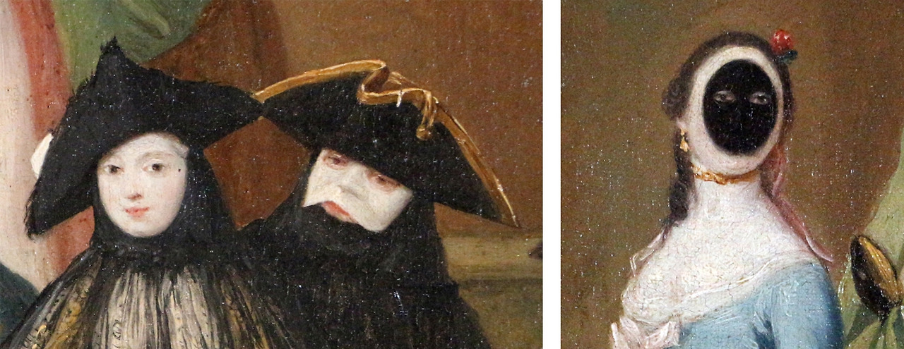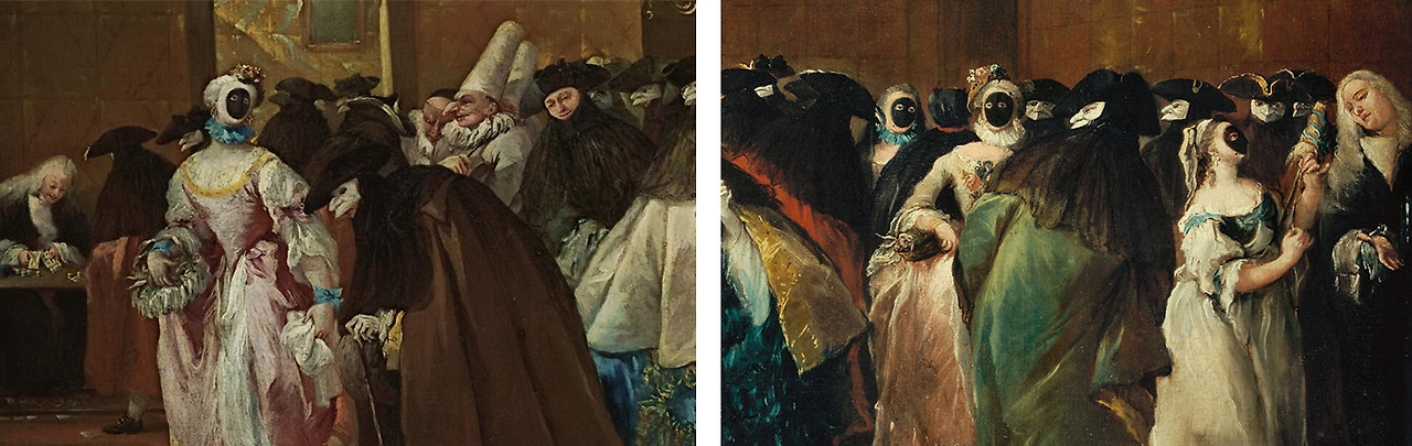 그림의 주인공은 마땅히 그림을 의뢰한 그리마니 부부여야겠지만... 왠지 맨 윗 줄의 검은색 가면을 쓴 여인이 눈길을 사로잡는다. 얼굴보다 작은 동그란 검은색 가면으로 인해 하얀 피부가 더욱 돋보이는 여인의 모습에서 약간의 기괴함까지 느껴지기도 한다. 바우타와는 달리 타원형의 검은색 가면 모레타는 여성을 위한 가면이었다.