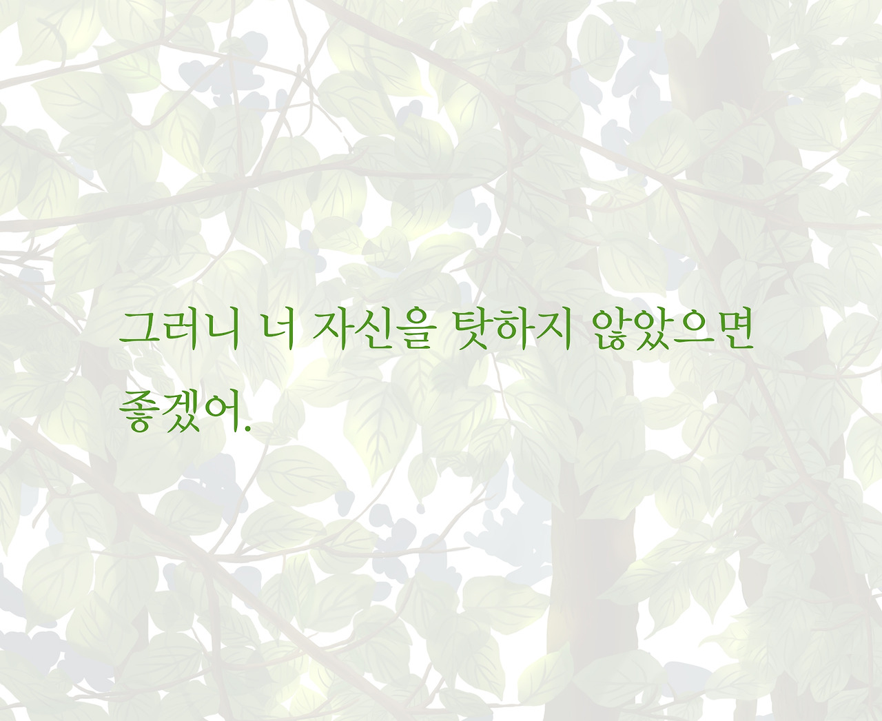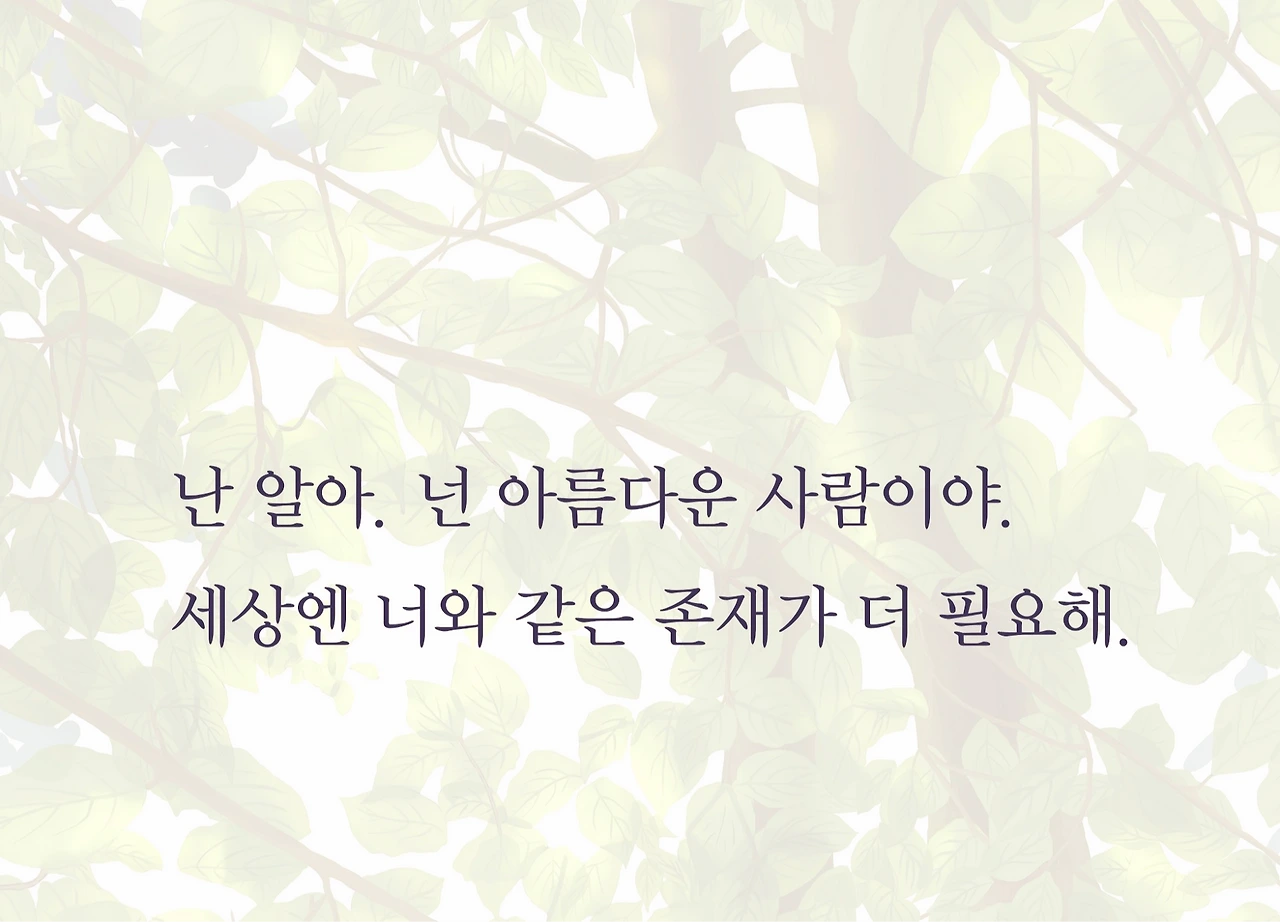 “넌 이미 그대로도 충분해. 아무것도 증명하지 않아도 돼. 너 스스로에게 상처 주지 마. 그대로만 있어도 괜찮아. 꽃을 피워주지 않아도, 숲에 가지 않아도 괜찮아."