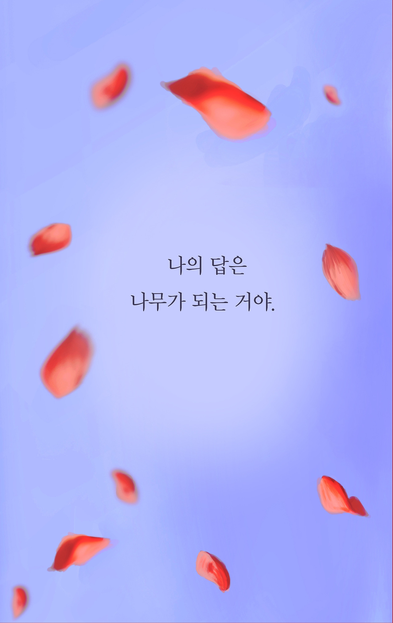 “아니. 나의 답은 나무가 되는 거야. 나는 나무가 되야지만 행복해질 수 있어. 나무가 되면 비로소 온 마음 가득 채워진 사랑과 편안함을 느낄 거야. 그러니 날 말리지 마. 난 내가 원하는 게 뭔지 알아."