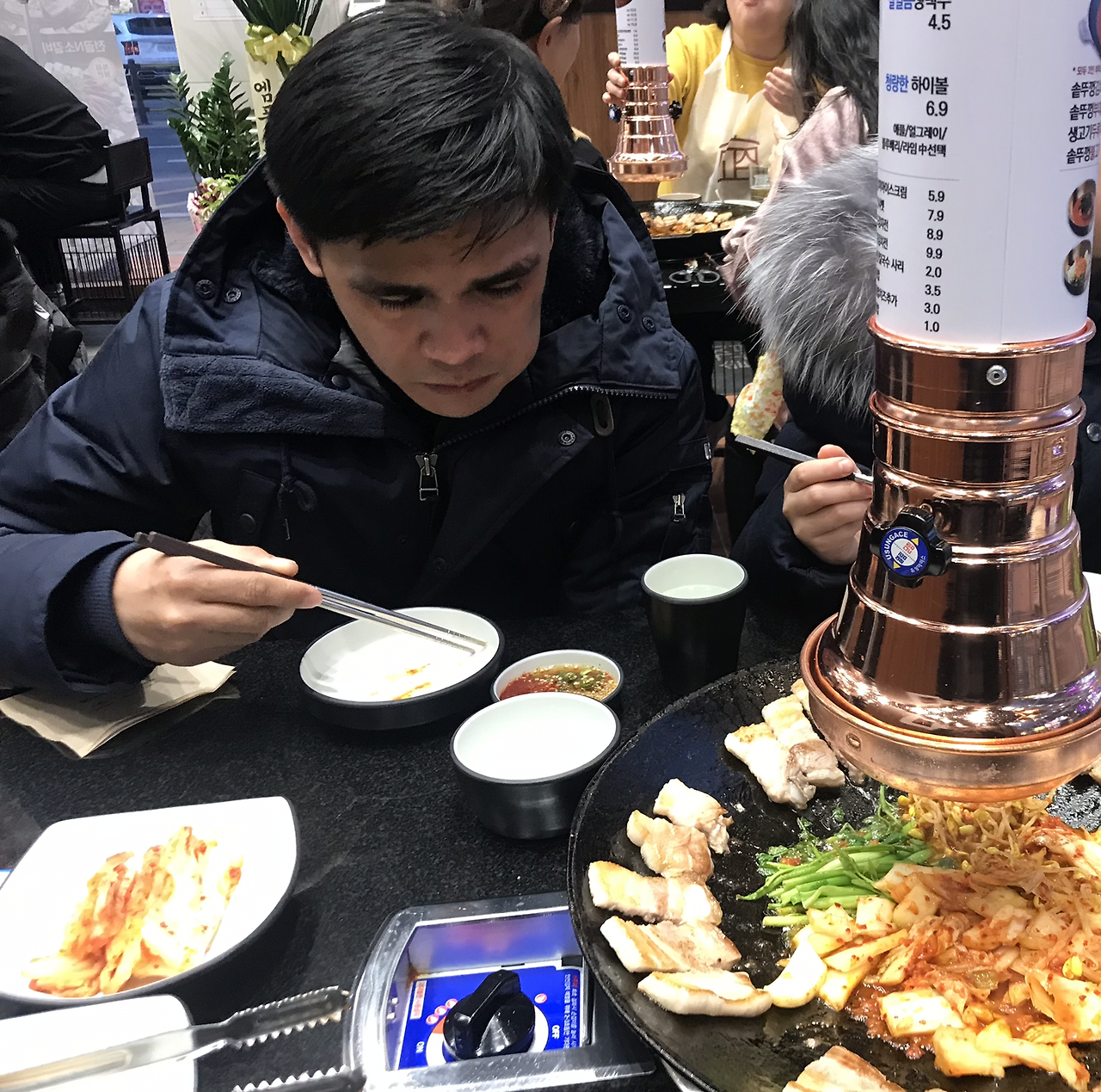 하루 종일 걸어 다녀 다리가 아팠지만 알찬 서울 구경을 마치고 솥뚜껑 삼겹살로 저녁을 마무리했습니다. 원래 소식하는 친구인데 치즈 볶음밥까지 맛있게 잘 먹어서 기분 좋았습니다. 동치미를 처음 먹어본 말론은 얼굴이 구겨졌지만 두 사발이나 드링킹 하는 적응속도를 보여줬습니다.