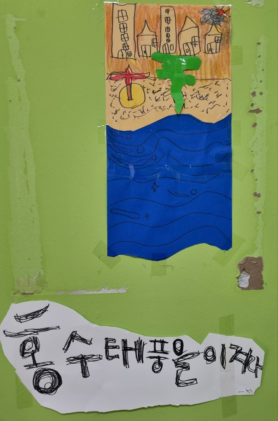 갈색과 노란색 땅과 해와 구름, 창문이 있는 집을 그리고, 사람이 없고 날씨가 덥고 태풍이 오고 있다. 나무가 있었는데 흔적없이 잘려졌고 근처에는 바다가 있다.