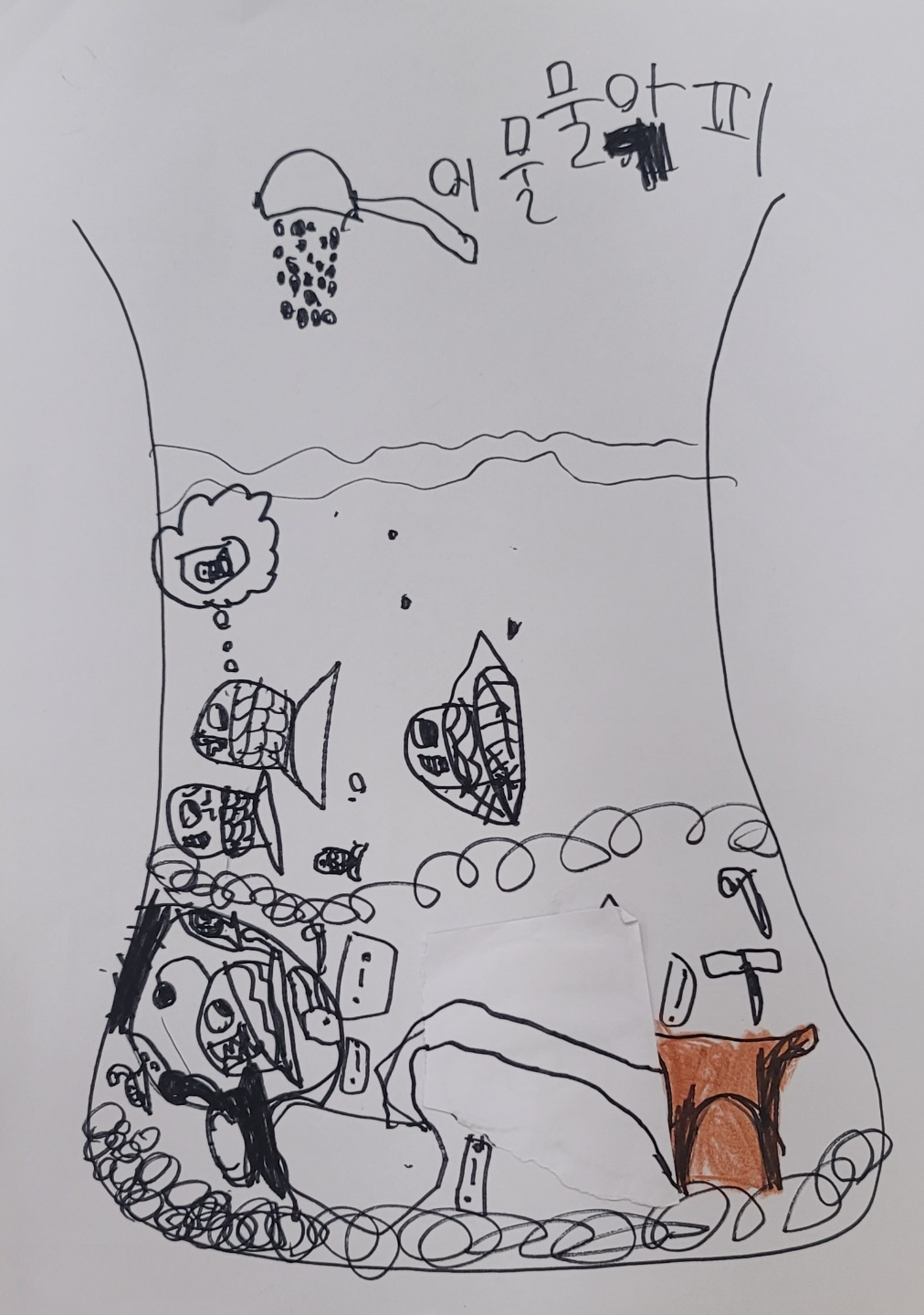 물고기를 통해 가족이 의인화 된다. 아빠 물고기는 가족을 위험으로부터 보호하지만 가족에게 바라는 것이 많은 모습이며, 엄마는 화를 내고 있는 모습이며, 자신은 어른들을 잘 따라하며, 동생은 재미있는 모습이라고 표현되었다. 아귀는 가족 분위기가 좋지 않을 때의 모습을 상징하는 것으로서 부모의 모습을 CCTV처럼 잘 살피고 사이렌 경보 즉 부모의 화가 심하게 나기 전에 통로를 통해 비밀의 장소인 안전한 곳으로 가고자 하는 자신의 모습이 드러난다.