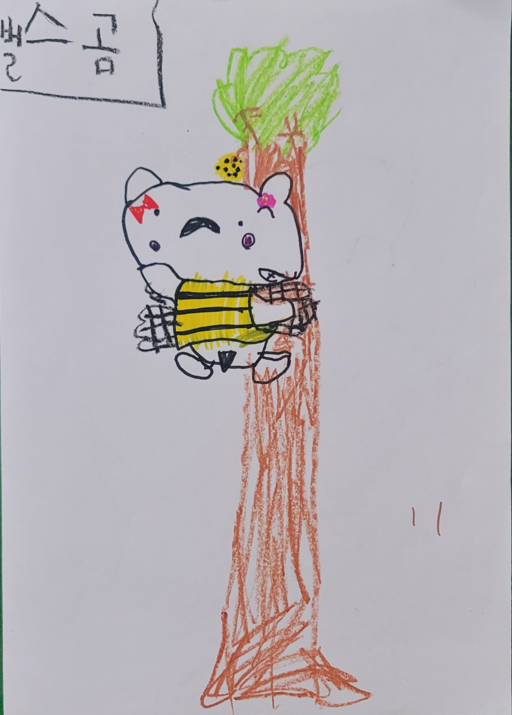 색연필 커버에 있는 곰을 따라 그리다가 곰을 벌로 변신시키고 날개와 벌침을 그린다. 그 후 나무를 그리고 벌집을 그리면서 벌이 벌집을 따먹기 위해 나무로 올라간다고 말한다.