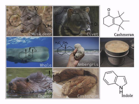 간략하게 위의 사진을 설명하면 대표적인 동물적 향료의 예시,
