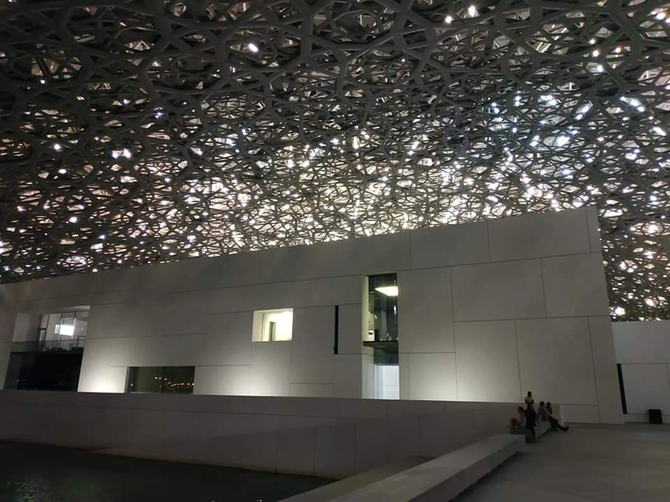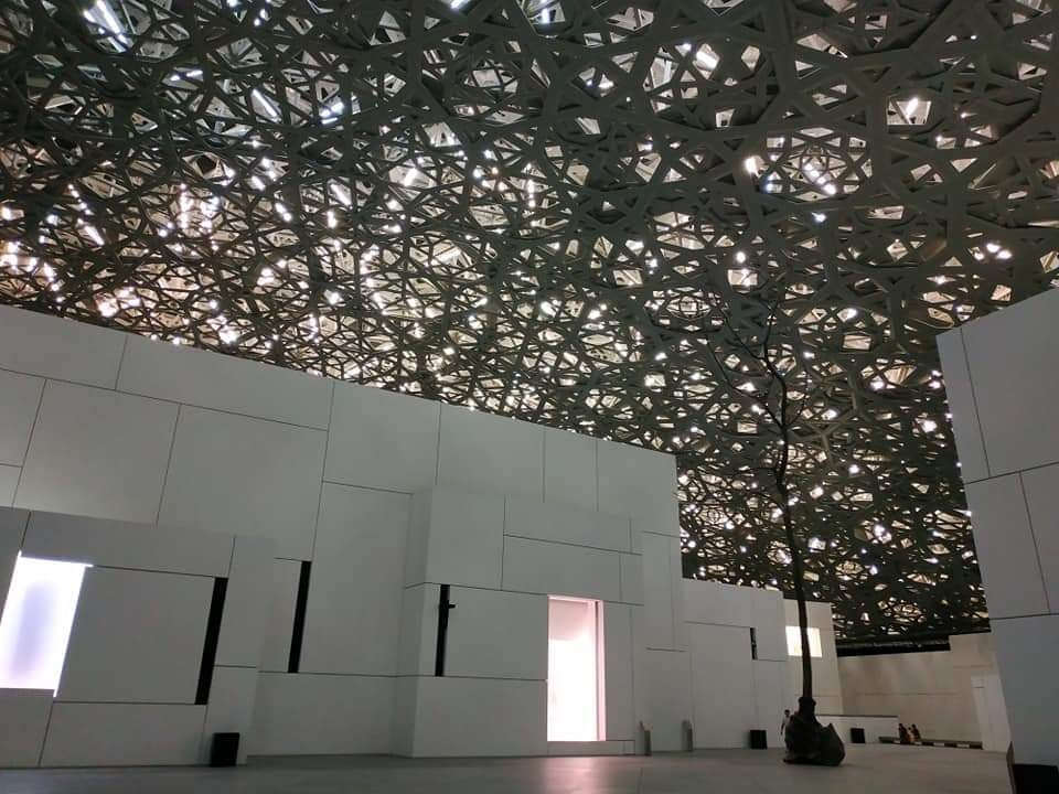 두 번째는 건축물이 세계적인 건축가 [장누벨]의 작품이기도 하기 때문이다. 프랑스 대표 건축가이자 건축계의 노벨상 프리츠커상 수상자인 장 누벨(Jean Nouvel)은 아부다비 도심 인근 사디야트 모래섬 부지에 아라비아 반도의 모양을 본뜬 돔의 형태로 박물관을 세웠다. 바닷물을 채우는 형식의 디자인을 통해 모래사막의 지열을 식히면서도 마치 물 위에 떠있는 듯한 외관을 지니고 있다. 또한 돔 형태의 양산과 같은 지붕을 만들어 사막 위의 뜨거운 햇빛을 차단하고 7850개의 구멍을 통해 지붕 사이로 스며드는 햇빛을 아랍 전통 문양 형태로 활용해 라이팅 효과가 매우 인상적이었다. 사막의 수중 도시를 떠오르게 하는 건축물 하나만으로 그 장엄함을 온몸으로 느낄 수 있었다.