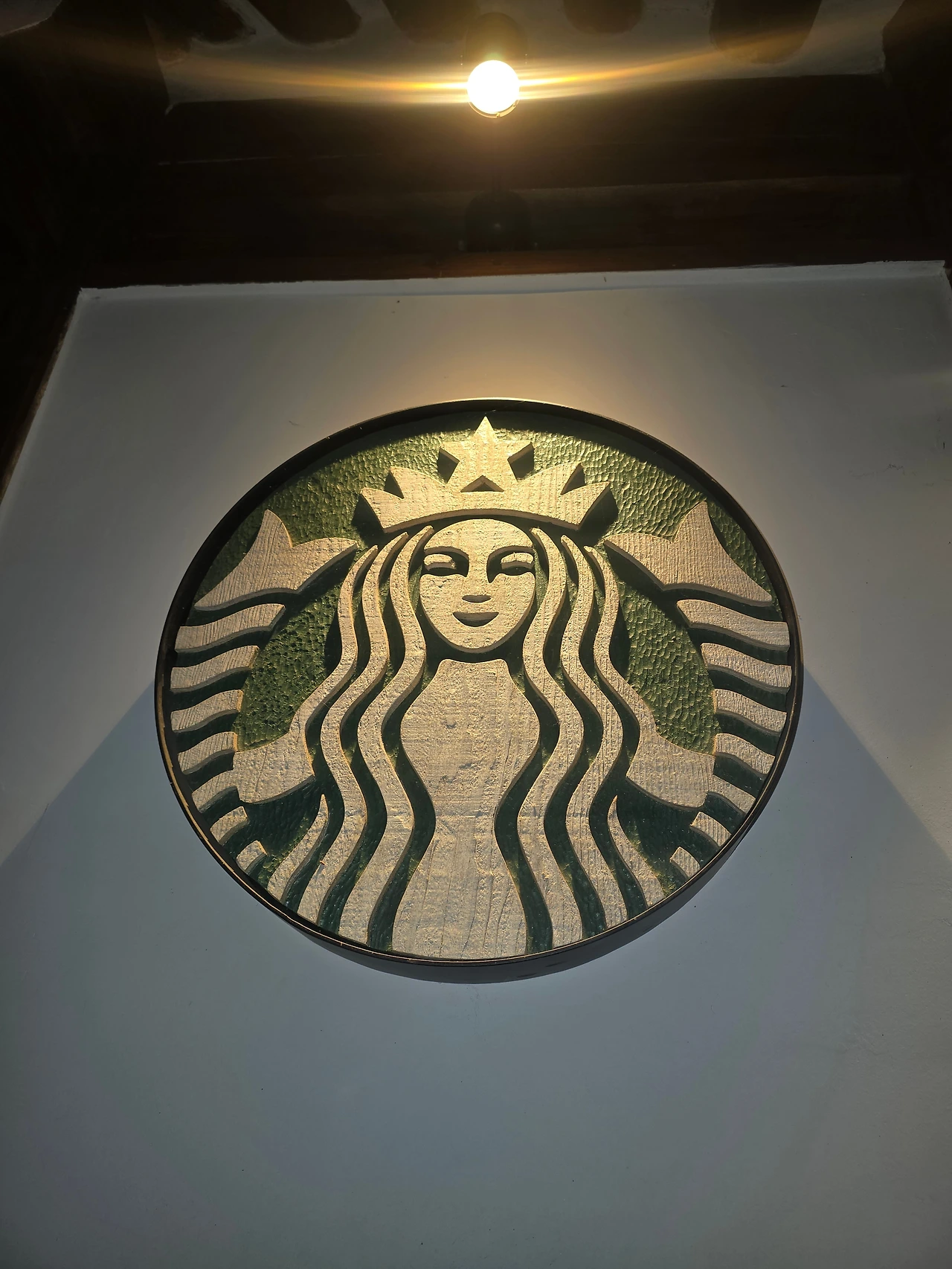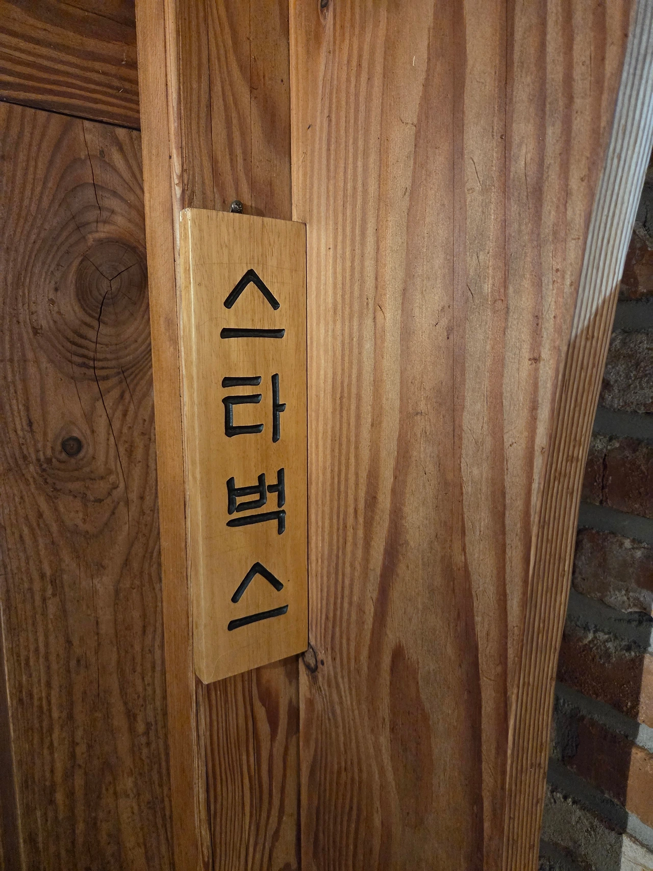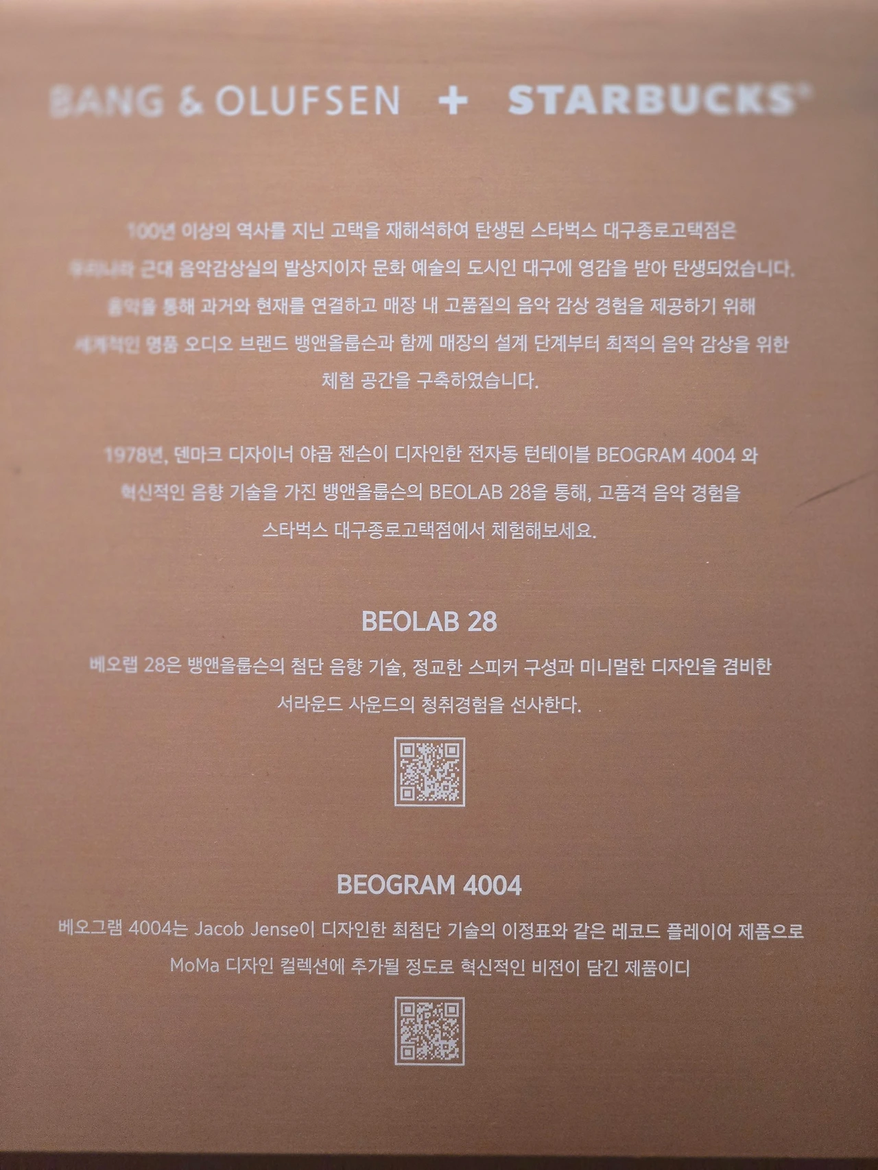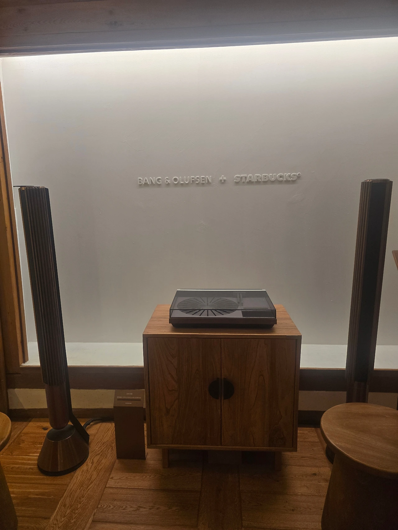 한옥에 어울리는 목재로 대들보를 형상화한 B&O의 멋스러운 스피커, 그리고 한옥과 어우러지는 한글현판과 목공예가에게 직접 의뢰했을 법한 소나무에 손수 새긴 스타벅스를 상징하는 세이렌 로고까지..