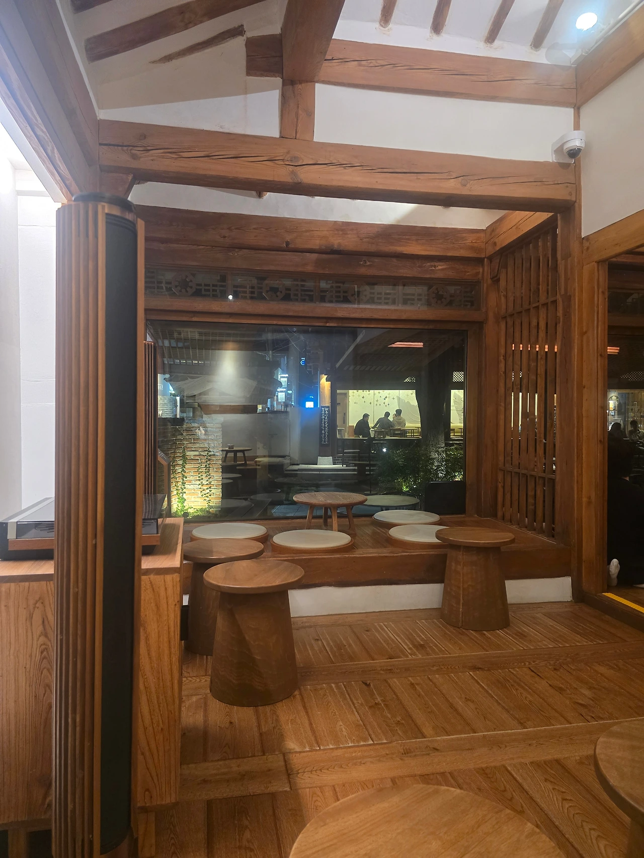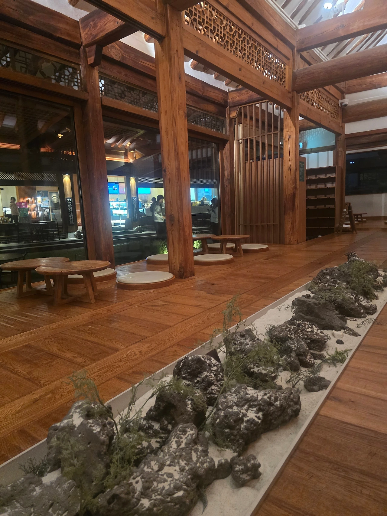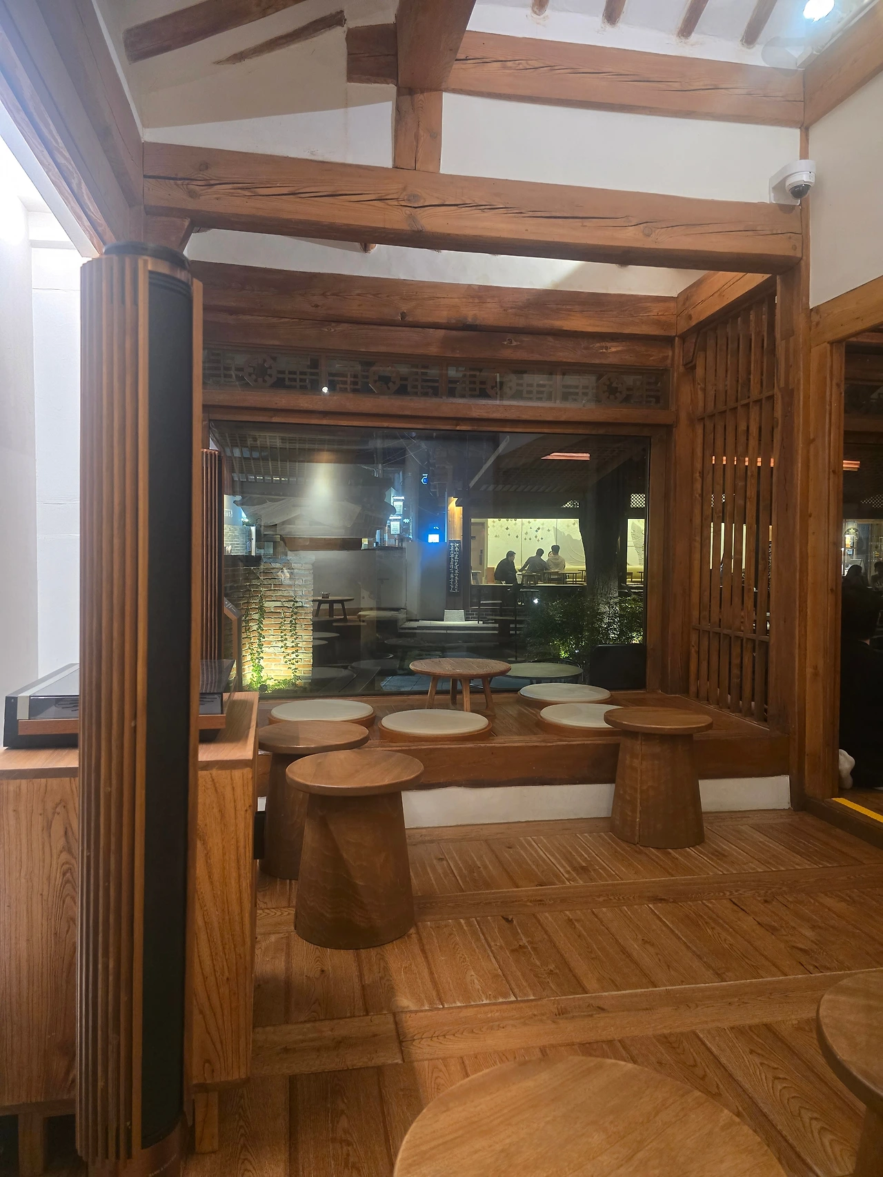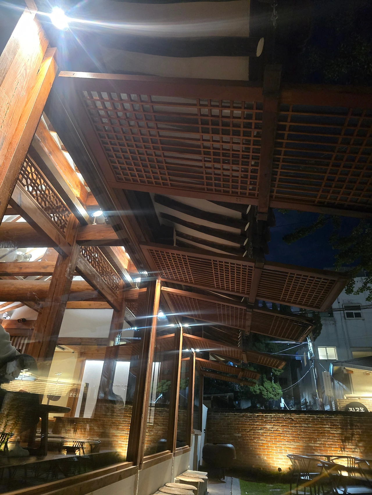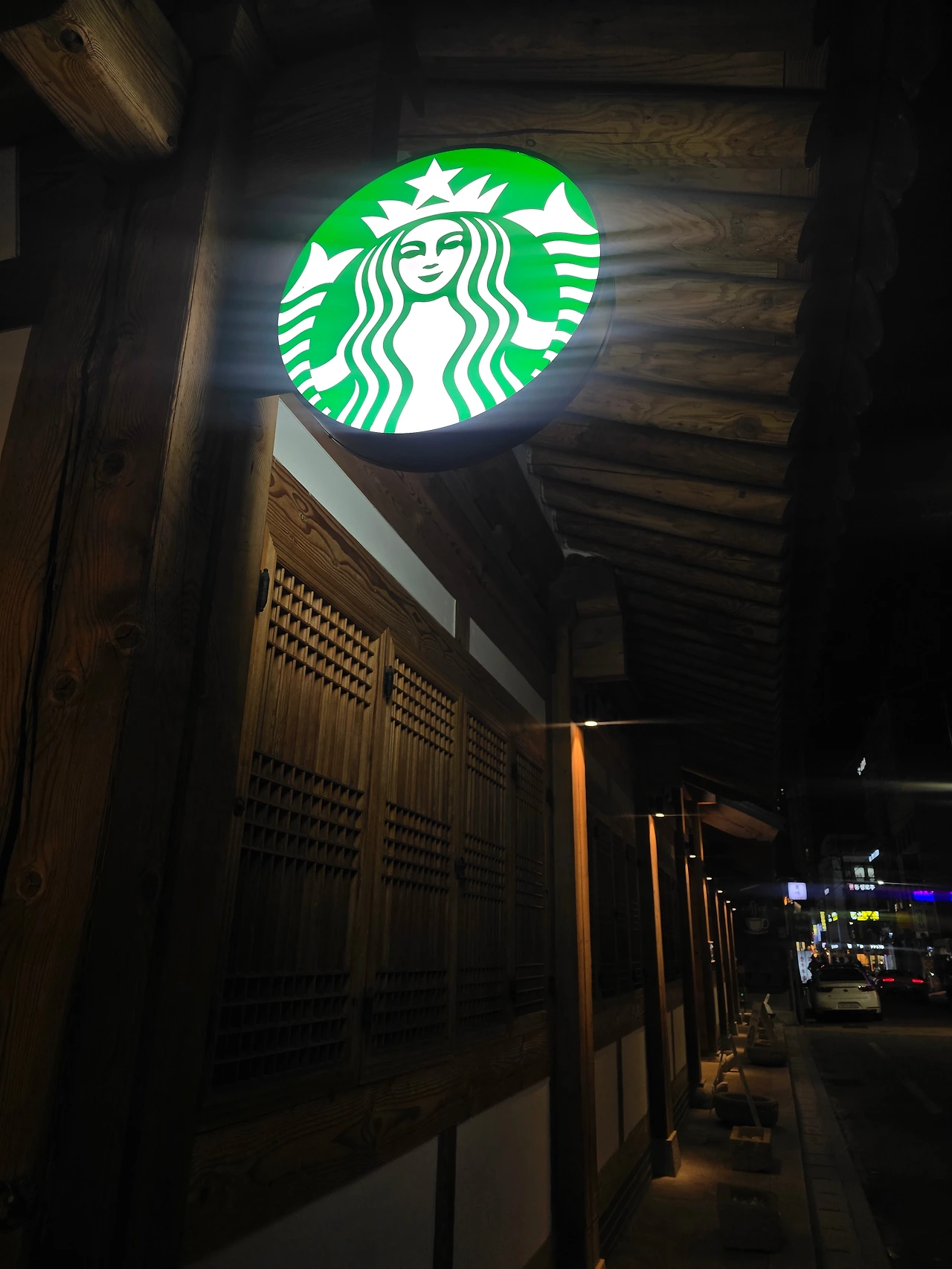 한옥에 어울리는 목재로 대들보를 형상화한 B&O의 멋스러운 스피커, 그리고 한옥과 어우러지는 한글현판과 목공예가에게 직접 의뢰했을 법한 소나무에 손수 새긴 스타벅스를 상징하는 세이렌 로고까지..