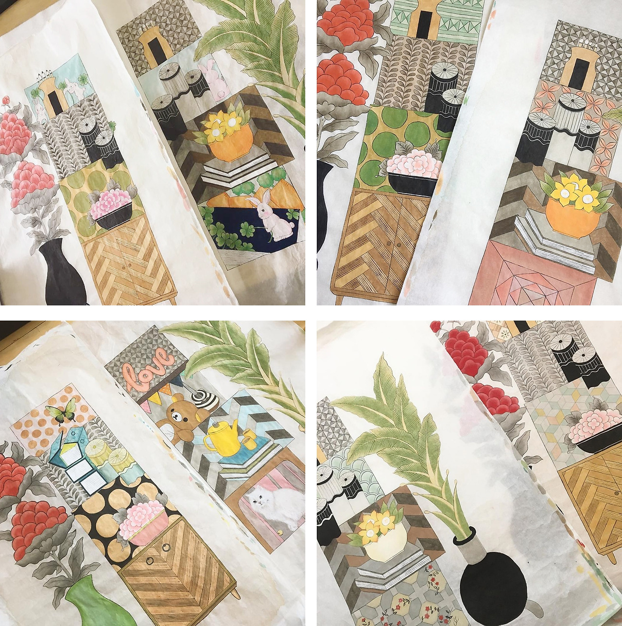 예전에 책가도 연작을 하며 그렸던 것을 새로 다시 작업하면서 나는 빈 칸에 무엇을 그릴까 며칠 고민하고 있었는데 잠들기 전 침대에 누워 책장 한켠에 모아둔 다 쓴 향수병과 초가 담겨있던 유리병들을 우두커니 바라보고 있으니 그래, 향기를 그려보자! 하는 생각이 번뜩 들었다. 향수는 드물게 가끔씩 사용하는데, 그 빈도수에 비해 많이도 샀던 향수 브랜드가 딥티크였다. 그 때도 좋아했고, 지금도 여전히 좋아해서 단상자 조차도 버리지 않고 아직 갖고 있다. 싸뺑(Sapin)이라는 초는 태우면 깊은 소나무 향기가 피어나 마치 숲속에 있는 것 같은 느낌이었고, 필로시코스(Philosykos)는 세련된 무화과 향의 향수이다. 이 향수는 몇 병이고 계속 사서 꽤 오랫동안 썼다.