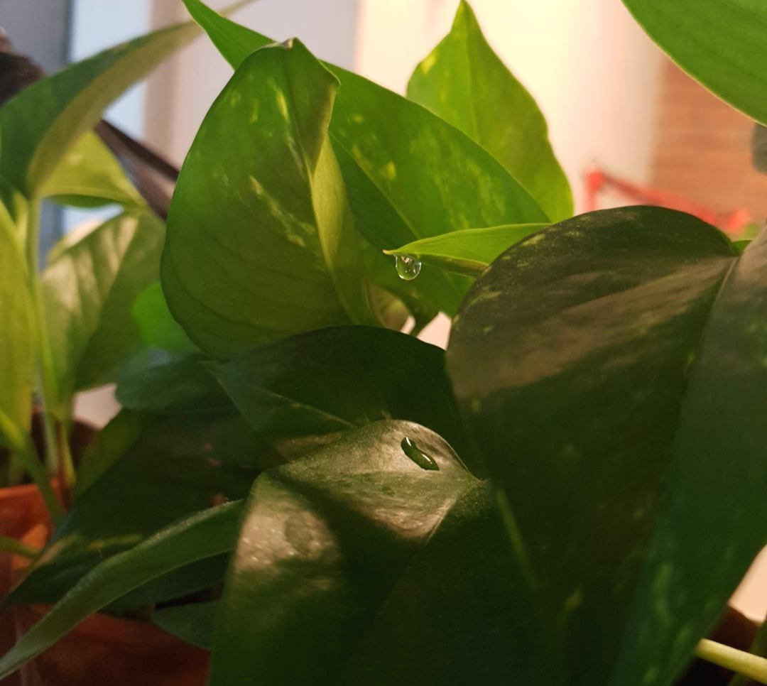 식물이 가득한 실내는 항상성을 유지해요. 미세먼지 수치는 늘 외부의 10% 정도, 습도는 60% 정도이고, 포름알데히드 수치도 매우 좋음 수준이에요. 습도가 높은 날엔 아침에 잎에 이슬이 맺히기도 해요. 사람들에게 얘기하니 믿을 수 없다는 얼굴이라 사진으로 남겨두었어요. 스킨답서스 잎에 이슬이 대롱대롱 매달립니다. 식물이 호흡하고 있다는 증표지요. 스스로 습도를 관리하니, 아침에 스프레이 하는 횟수도 줄였습니다.