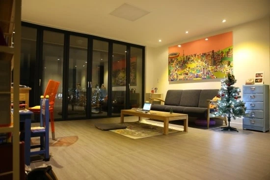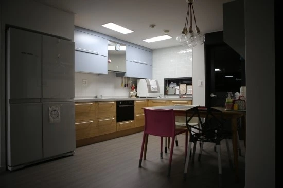 주방과 거실엔 아들이 장난감을 갖고 놀아도 바닥이 상하지 않도록 회색 타일을 깔았다. 베란다는 확장하지 않고 폴딩도어를 설치했지만, 바닥을 높여 여름엔 폴딩을 열면 거실이 베란다까지 확장된 느낌이 들도록 해 실용성과 기능성을 둘 다 잡았다. 벽은 흰색 페인트와 똑같은 벽지를 찾아 도배를 하고, 천정에는 등을 매입해 깨끗하게 마무리했다.