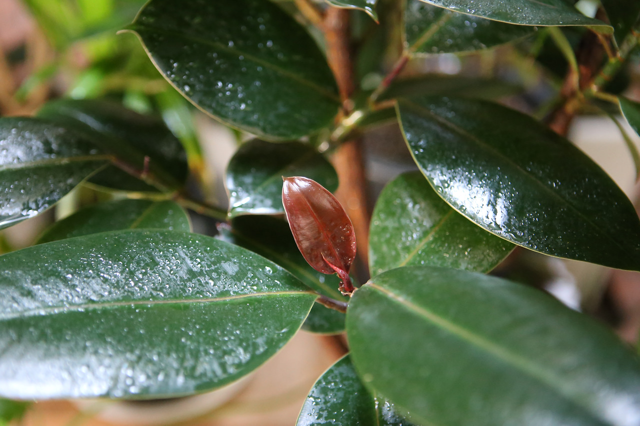 고무나무의 새잎도 좋아해요. 이 나무는 잎사귀를 부드러운 포장지로 한 번 싸서 틔워 올립니다. 처음엔 빨간 꼬챙이처럼 뾰족하게 고개를 내미는데 돌돌 말려 있던 잎이 펴지면서 껍질은 떨어지고 새잎은 반짝거리는 자태를 뽐내며 완전히 펴져요. 굳이 껍질을 제거해 주지 않아도 스스로 떨구는데, 저는 늘 과잉 친절을 베풉니다.