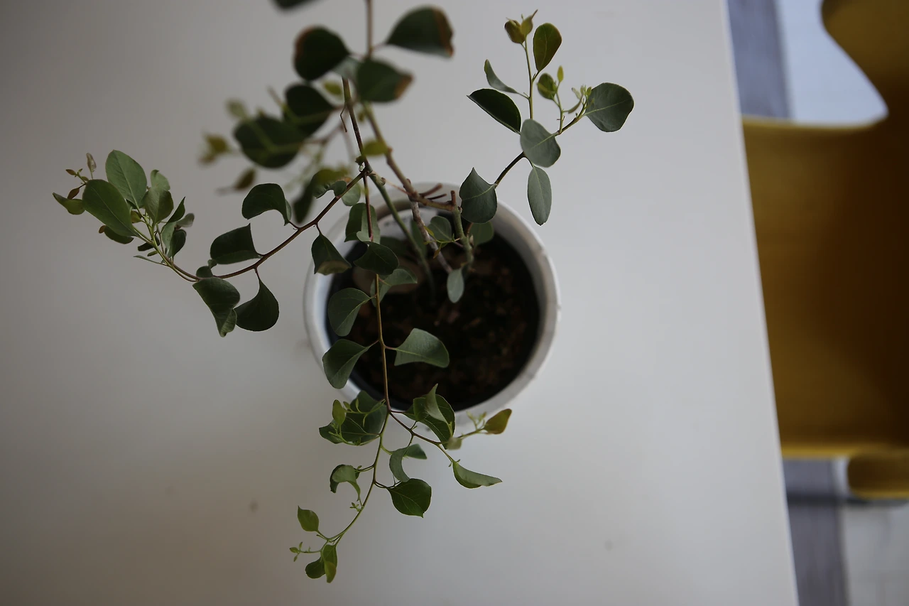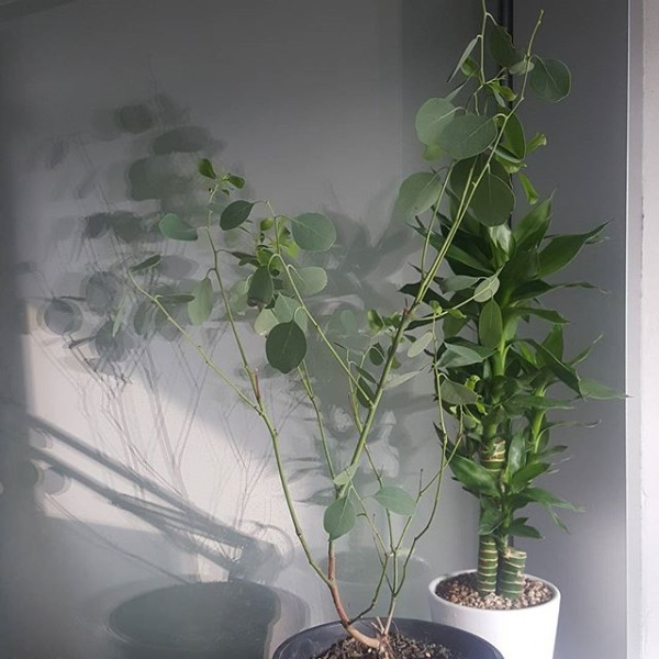 유칼립투스의 새잎은 자기 마음대로 아무 데서나 튀어나와요. 물을 좋아하고 이 녀석은 삐지기도 잘 하는데요, 조금만 마음에 안 들면 잎이 쪼글쪼글해지거나 퍼석해져요. 까다로운 녀석. 자기 기분 내키면 잎 사이사이에 불규칙하게 작은 잎을 멋대로 틔워 올리는데요, 완전 기분파예요. 모시고 사는 대표적 식물. 예쁘고 향이 좋은 식물들은 벌레도 좋아합니다. 관리가 아주 까다로운 편이라 식물에 꽤 자신이 붙은 중급 이상이 도전해 보실만한 식물이에요.