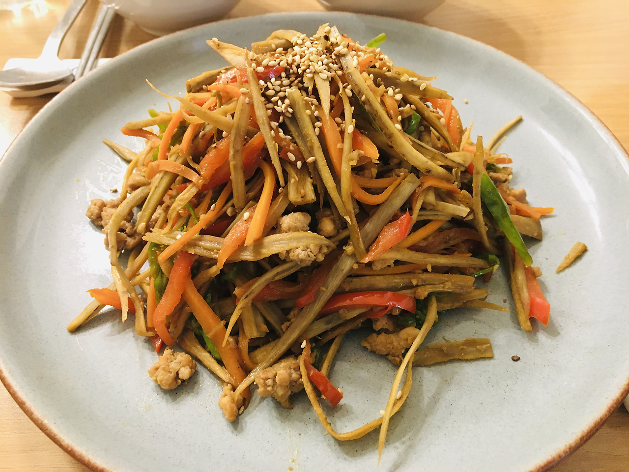 기본적으로 조리방법은 간단했다. 소금, 후추 간을 한 갈은 돼지고기를 팬에 먼저 볶고 잠시 접시에 대기시켜두었다. 돼지고기가 남기고 간 기름에 우엉을 볶고, 당근과 풋고추, 파프리카 순으로 볶은 다음 다시 돼지고기를 넣어서 함께 볶으면 끝이다. 중간중간 간장과 설탕으로 간을 해주고 마지막에 후추와 참깨, 참기름을 뿌려주었다. 개인적으로 내 입맛엔 간장 베이스의 요리들이 느끼해서 다진 마늘을 넣어서 맛의 조화를 잡아주었다.