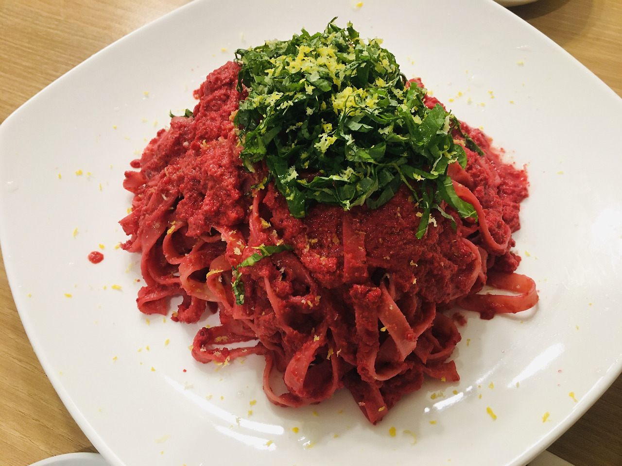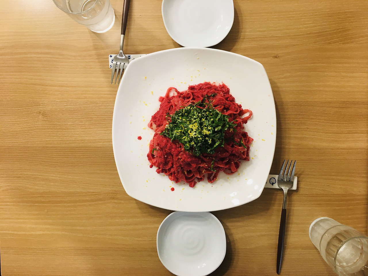 관건은 비트 특유의 흙냄새를 잡는 것이었다. 비트 파스타는 검색해도 레시피가 나오지 않아 혼자서 이리 해보고 저리 해보면서 연구했다. 바질 페스토 파스타 하듯 갈은 비트를 팬에 넣어서 볶아보았는데 별로였다. 찜기에 찌면 비트의 흙냄새가 나아진다고 해서 해보았지만 확실한 변화를 이끌어내진 못했다. 개수대에 실패가 쌓여갔다.