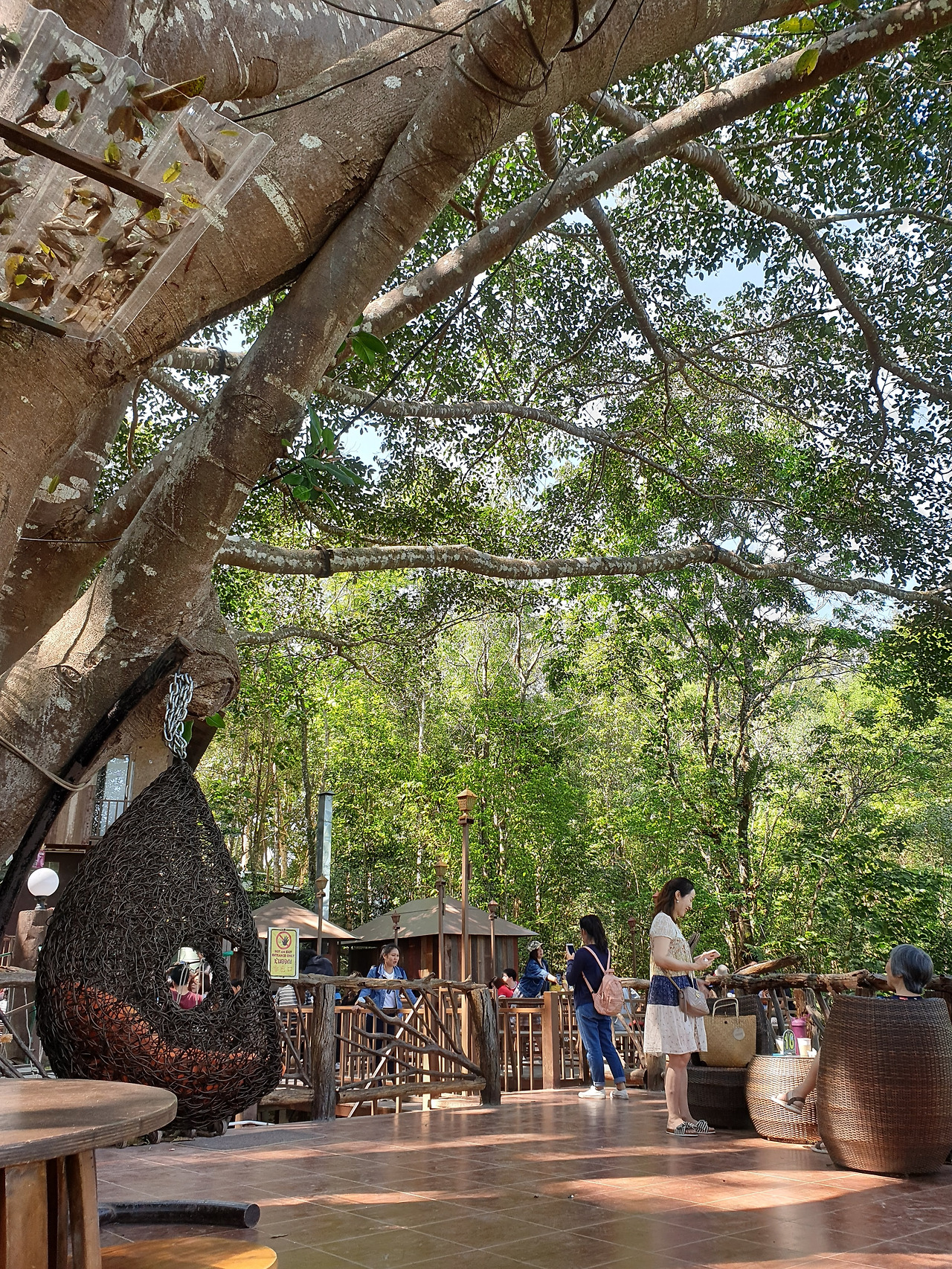 구름다리는 두 개다. 한 다리가 입구, 한 다리가 출구다. 출렁대지만, 아무도 죽일 수 없다. 두 명 이상 동시 이용 금지. 구름다리를 건너면 사진에서 보는 테이블들이 사방에 펼쳐져 있다. 어떤 테이블은 공중에 떠 있는 것만 같다. 어떤 테이블은 펼쳐진 숲의 시작처럼 보인다. 수십 개의 테이블은 꽉 차 있다. 거대한 나무 하나로 새로운 공간이 창조되었다. 이 나무에겐 괴로움이다. 거기까지 생각하지 않기로 한다. 환경을 파괴하는 파렴치한 세상이, 내 복통처럼, 무좀처럼 괴롭지 않다. 피상적이다. 절절이 아프지 않다. 이 어리석음은 피눈물로 내게 되돌아올지도 모른다. 당장은 이 깊은 숲, 거인국의 우산대 같은 나무가 황홀하다.